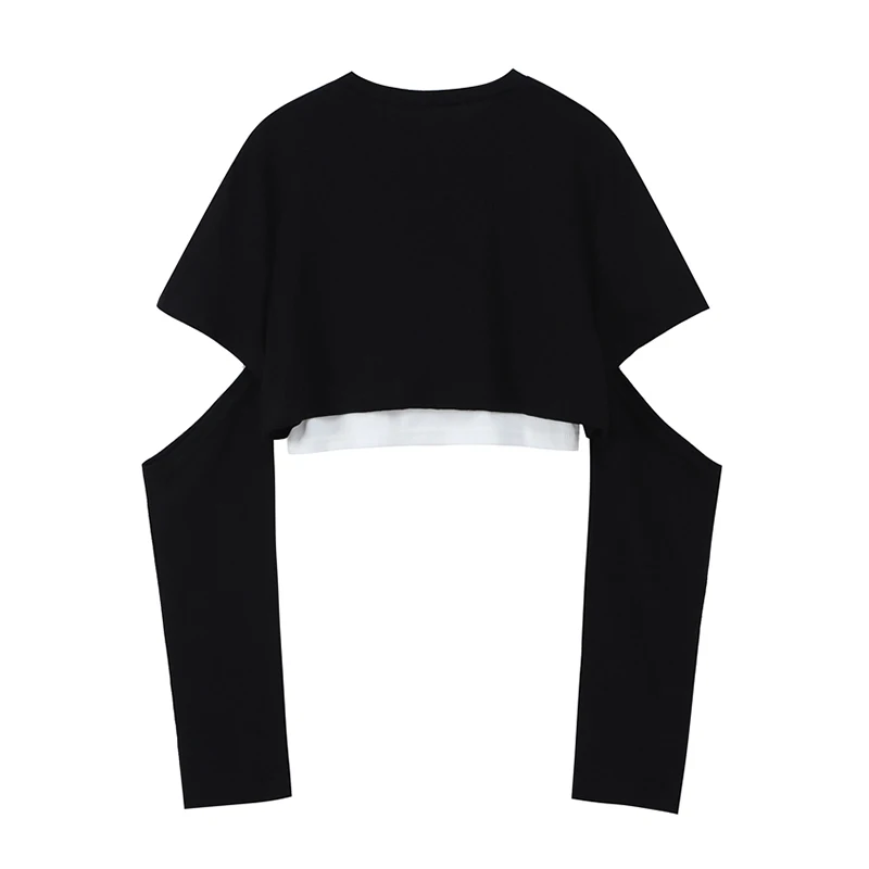 Женский повседневный уличный короткий топ, Белая кофта и черный пуловер с круглым вырезом и длинным рукавом, комплект из футболки с разрезом, женские весенние комплекты 2021