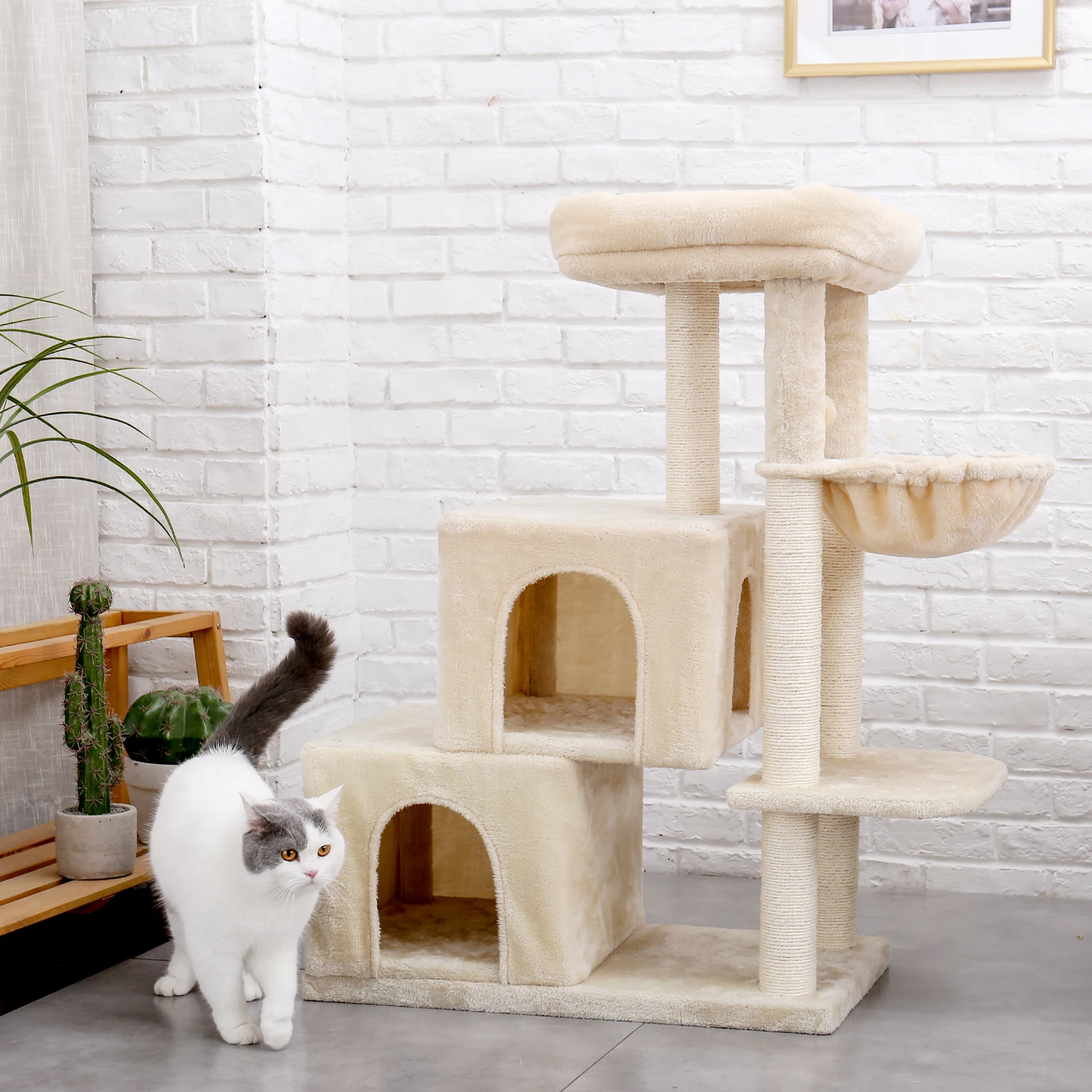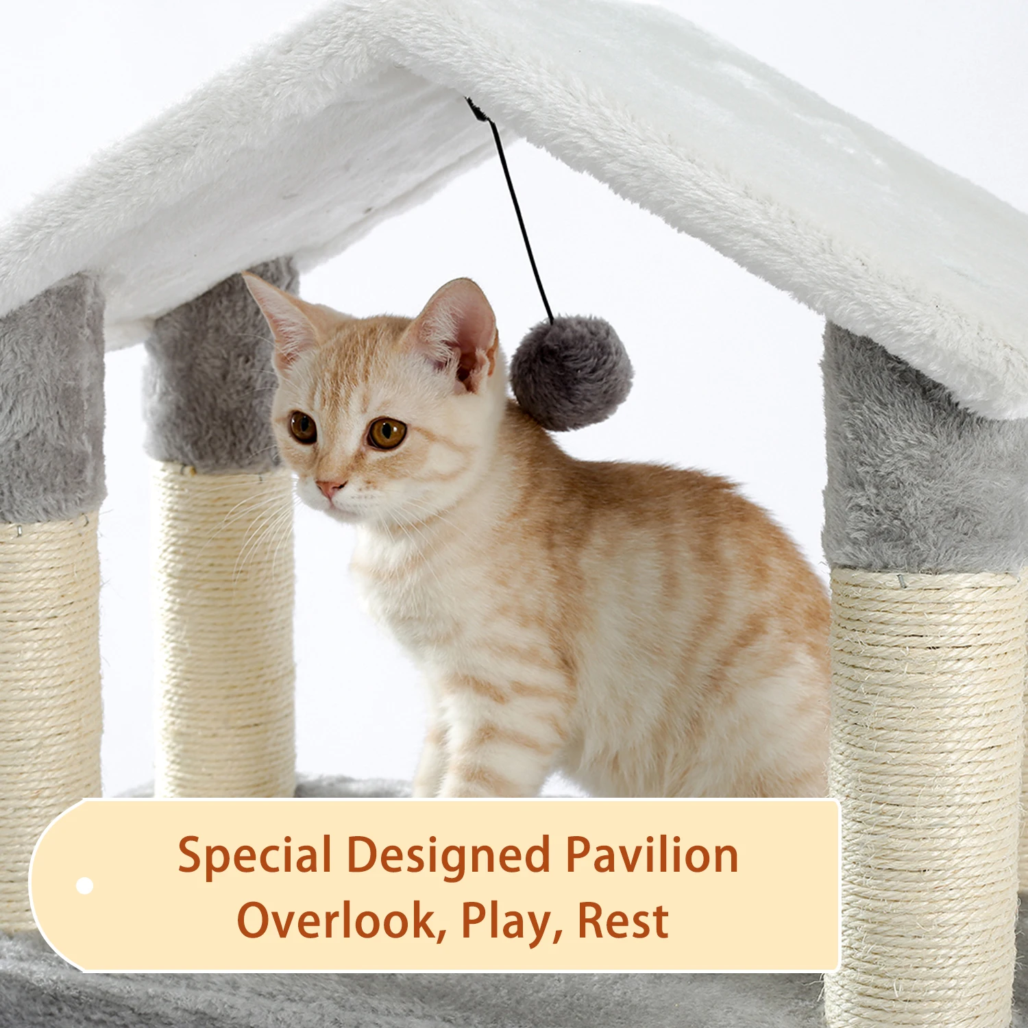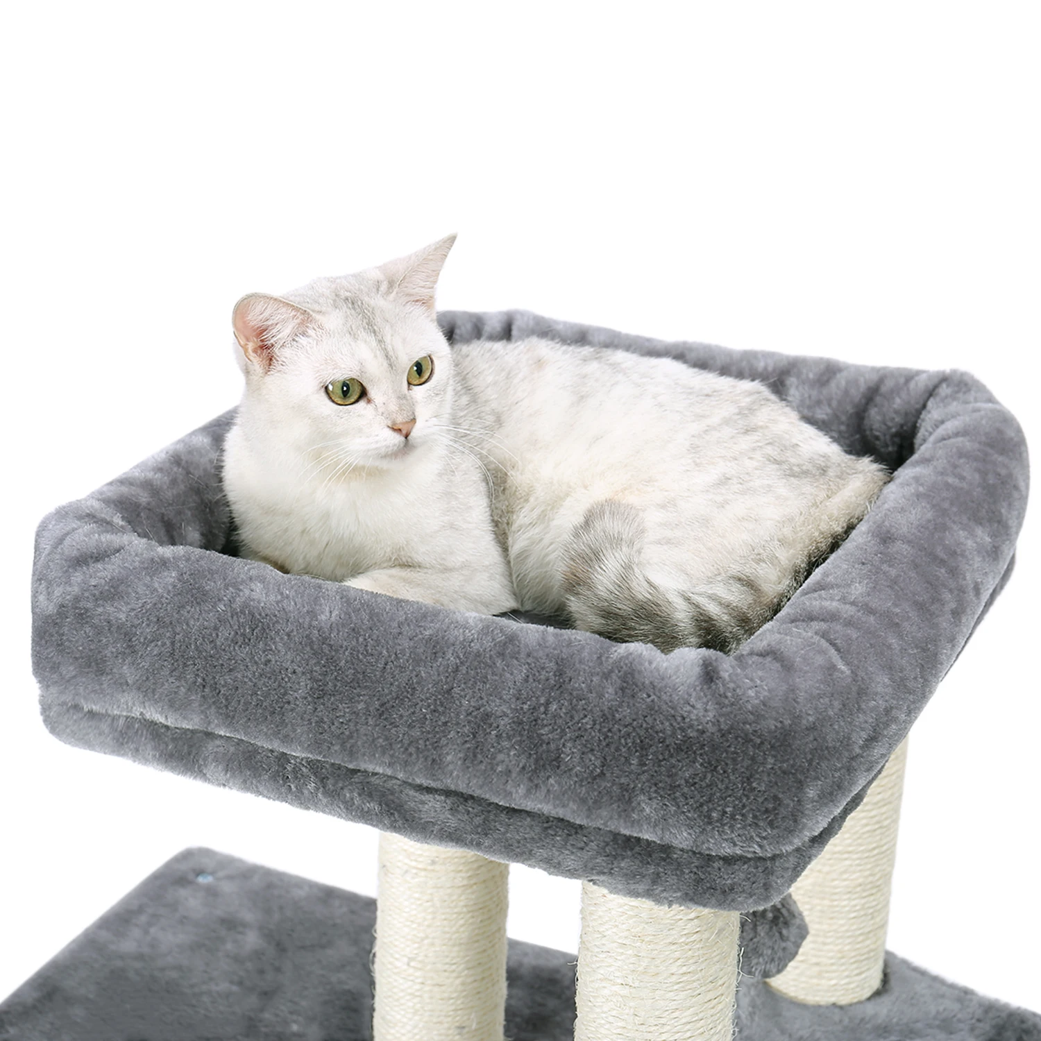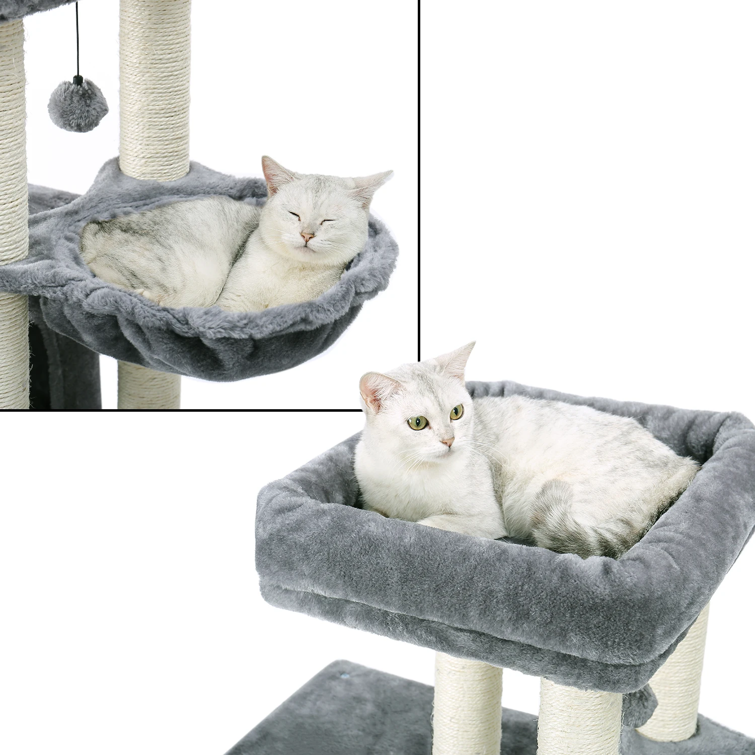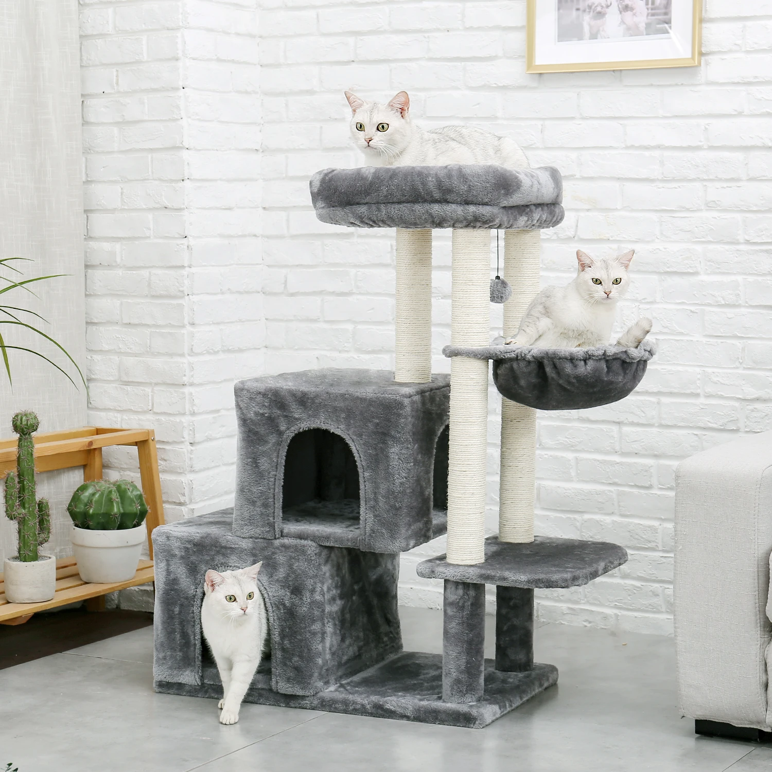 Кошачье дерево, многоуровневая башня с когтеточками, кошачьи столбы, Сизалевые столбы, гамак, платформа для прыжков с шариком, серого цвета