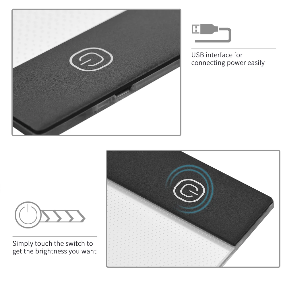 А4Особенности:Питание поставляется через usb-кабель, удобный для доступа к любому usb-порту, например, компьютеру, usb-разъему или даже внешнему аккумулятору.11,8*8,5 "с подсветкой, супер яркий, и не мерцает, легкий и портативный.Плавное затемнение с функцией яркости памяти для вашего следующего использования, тем временем светильник защищает глаза и эффективно.Этот товар имеет отдельную расширенную доску, вы можете использовать его по своему усмотрению.Зажим для фиксации отдельной доски и бумаги для рисования и фиксации на поверхности.Высокая прозрачная акриловая панель с большой прочностью и долговечностью.Подходит для медицинской визуализации, анимации, тату, одежды, алмазного рисунка, искусства и т. д.Характеристики:Материал: акрилСветильник источник света: светодиодныйОсвещенное пространство: 30*21 см/11,8 * 8.in (Ш * д) , 36 см/14.in( Диагональ)Рабочее напряжение: 5 В постоянного токаИнтерфейс: Micro USB (например, компьютерный интерфейс, блок питания и т. д.)Длина кабеля USB: Approx.2m / 78.inТовар Размеры: 21,5*33*0,35 см/8,5*13 * 0.1inРазмер посылка: 36*24*3,5 см/14,1*9,4 * 1.inВес посылка: прибл. 440g/15,5 ozПосылка:1 * светильник1 * USB кабель (2 м/78,7 ")1 * масштабированная доска1 * зажимПримечание:Для источника питания, мы просто поставляем вам usb-кабель, вы можете питаться с универсальным адаптером телефона, баком питания или другим интерфейсом USB.Посылка включает в себя только светильник, usb-кабель, масштабируемую плату и зажим.