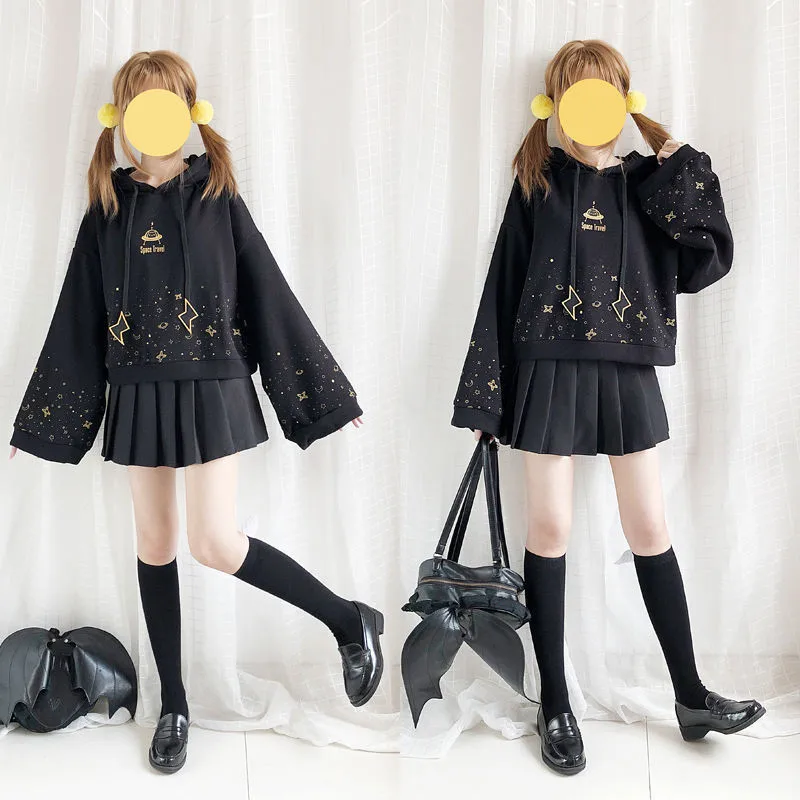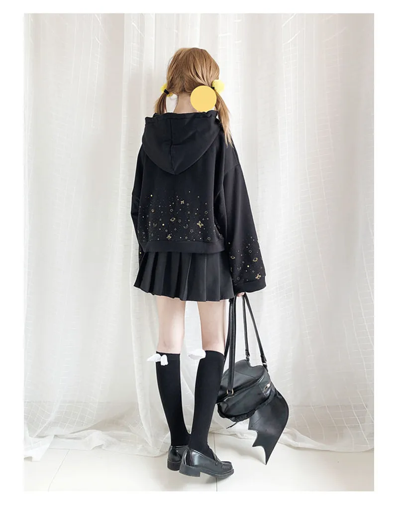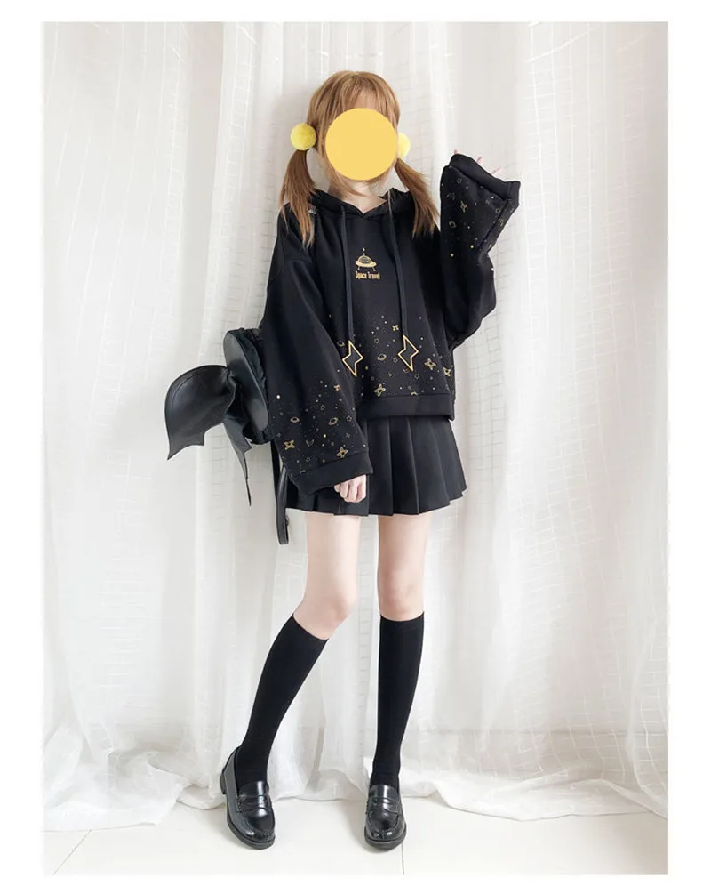 Черные толстовки Harajuku с капюшоном флисовые толстовки пуловеры японские кавайные девушки Подростковая свободная уличная Готическая Толстовка для женщин