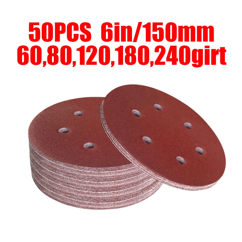 Наждачная бумага из оксида алюминия, 6 дюймов, 150 мм, 6 отверстий, 60 80 120 180 240, абразивная наждачная бумага, многофункциональный инструмент, 50 шт.