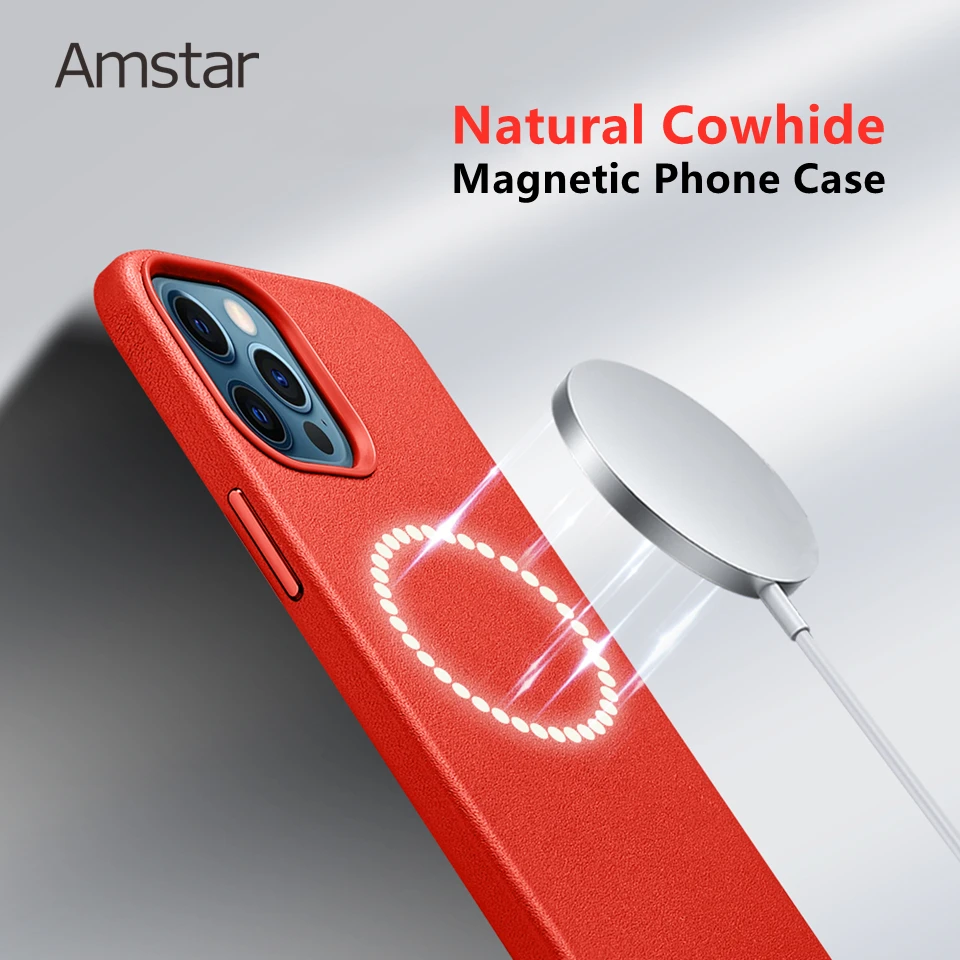 Чехол Amstar для телефона iPhone 12 Pro Max, магнитный чехол из натуральной воловьей кожи с беспроводной зарядкой, чехлы для iPhone 12 Mini
