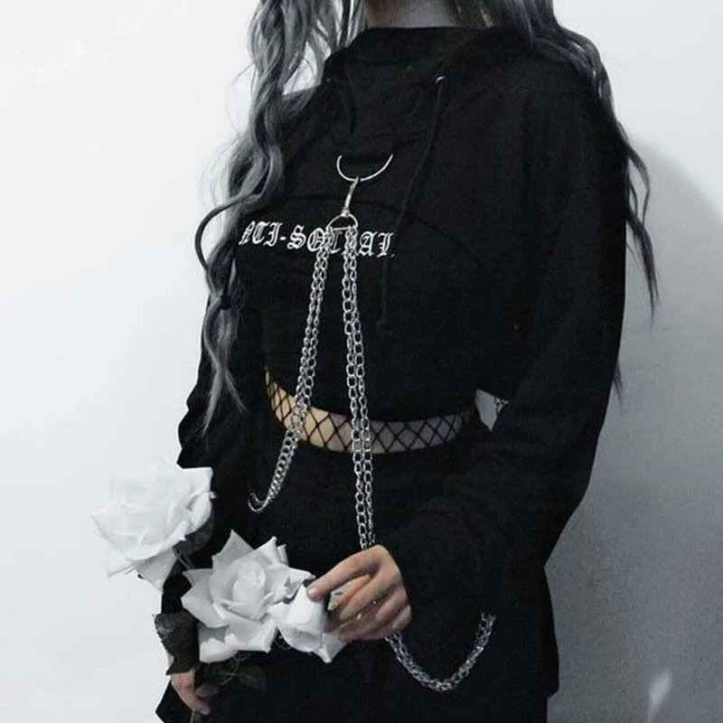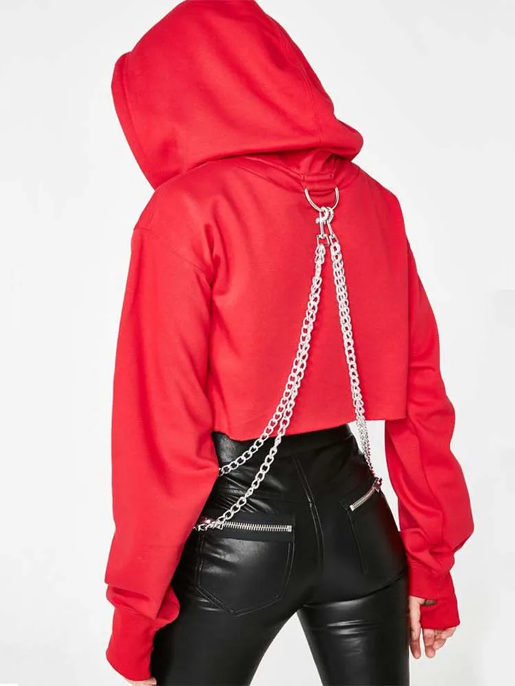 Punk Metal Chain Solid Black HoodyStreetwear Sweatshirt Hoodie Crop Top