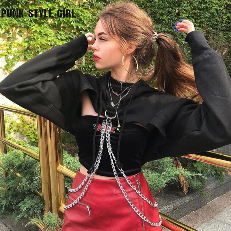 Худи женское в стиле K-POP, свитшот с цепочкой в стиле панк, готический короткий топ с открытой грудью и металлической цепочкой в стиле хип-хоп, Харадзюку