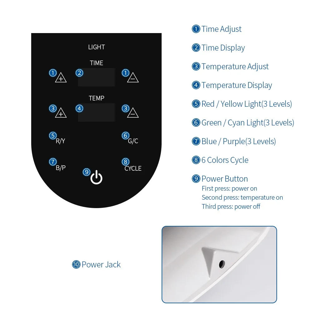 1. Отображаемое время означает, что при выключении всех функций. В конце времени все функции будут выключены. Если включена только одна Функция нагрева, пожалуйста, обратите внимание на время использования. 2. Каждый человек имеет разную температуру. Функция нагрева включена для достижения указанной температуры-это постепенный процесс нагрева. Поэтому клиентам рекомендуется начинать с более низкой температуры и использовать наиболее подходящую для них температуру 3. Лучший эффект, если вы используете продукт по уходу за кожей (эссенция, лосьон, маска...)