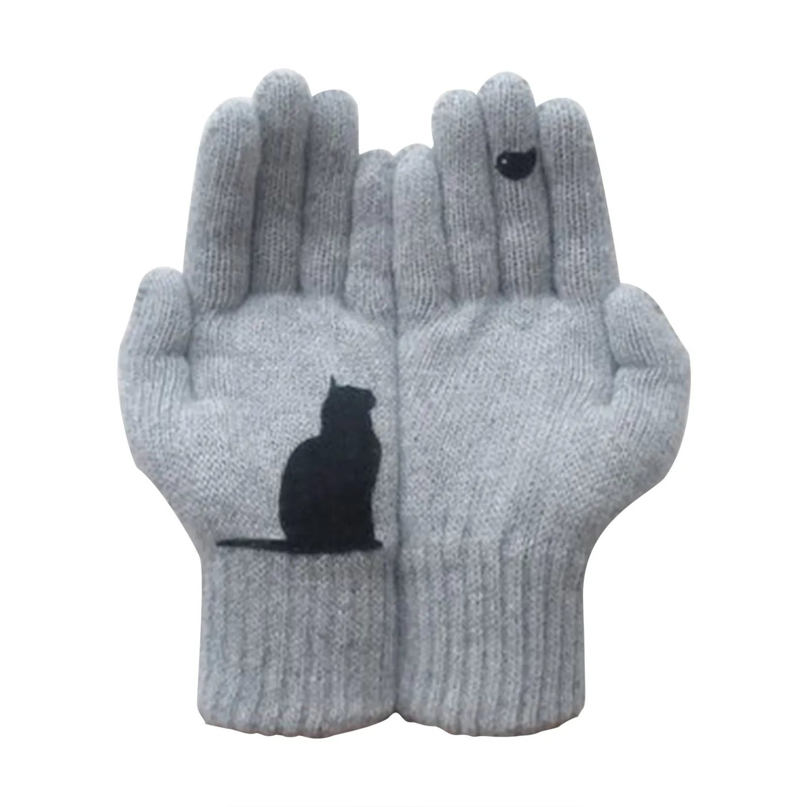 Зимние Хлопковые женские шерстяные перчатки, теплые кашемировые уличные теплые перчатки унисекс с принтом кошки на осень и зиму