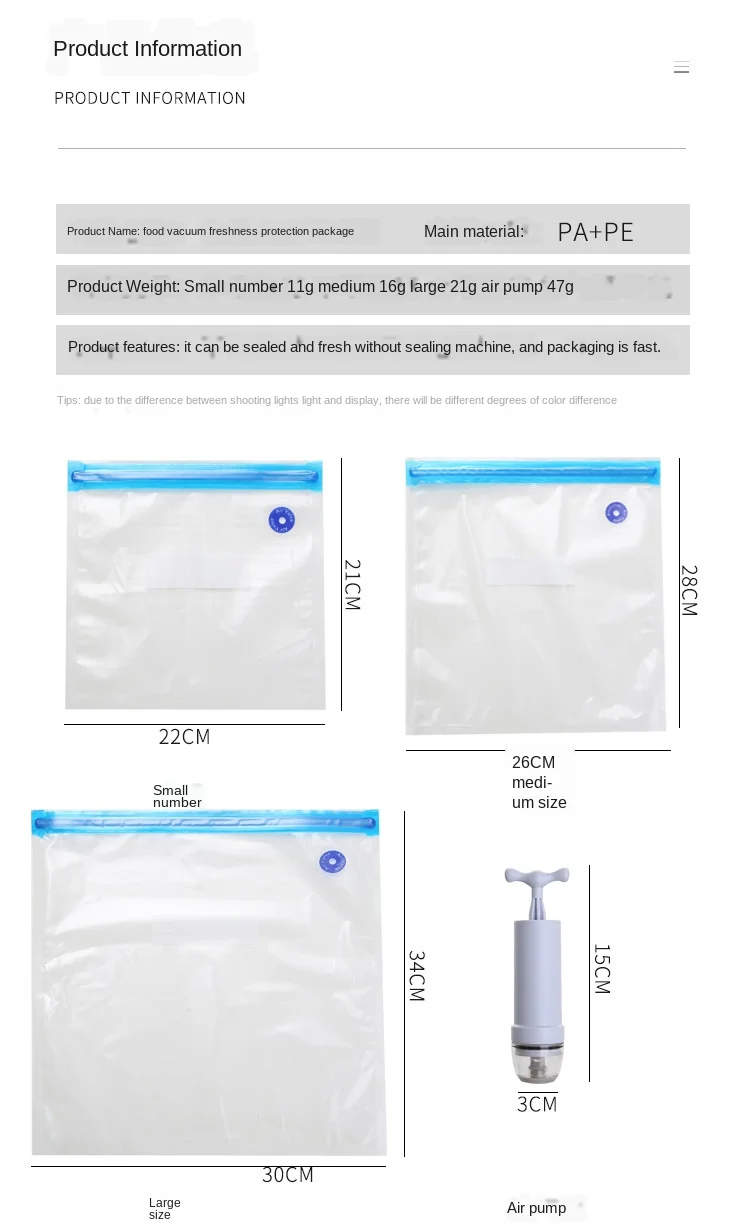 Мешки изготовлены из PA + PE, насос изготовлен из АБС-пластика, не содержит бисфенола А, безопасен для морозильной камеры и варить
