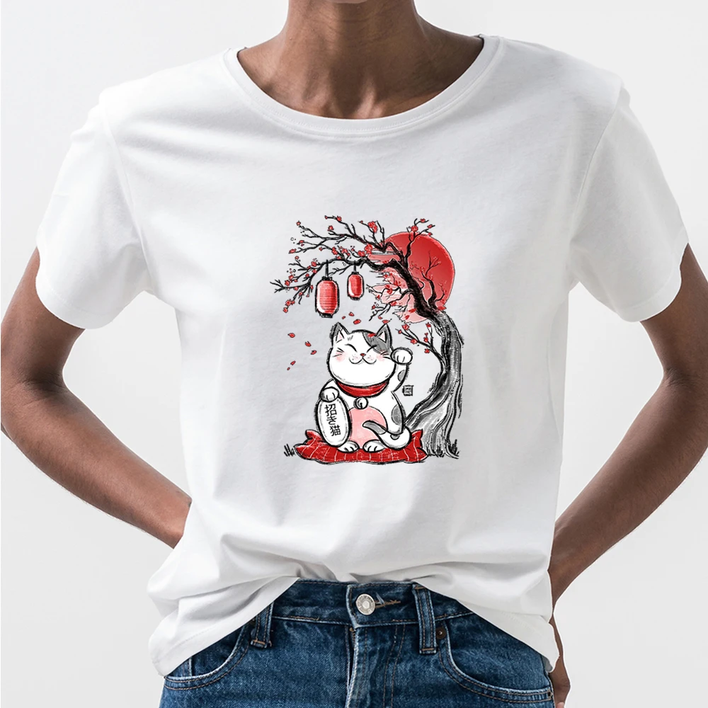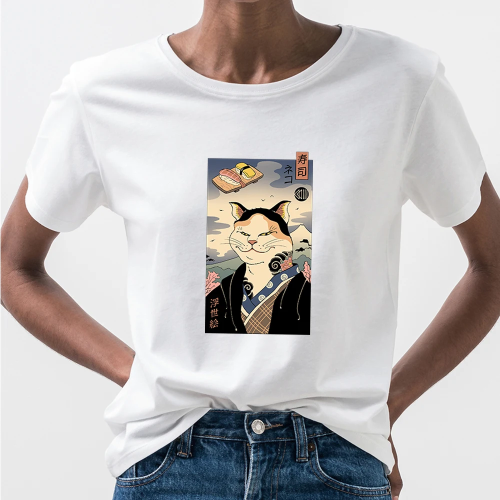 Футболка женская с круглым вырезом, белый топ с мультяшным принтом кота, карате, уличная одежда, повседневная рубашка в стиле панк, Харадзюку