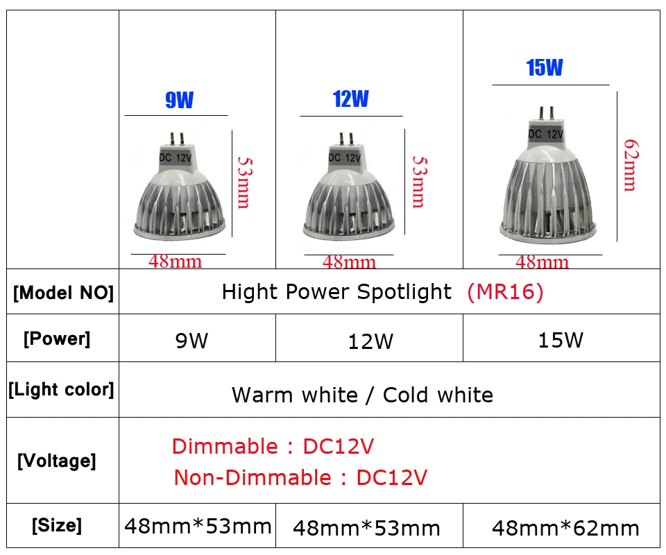 -Размер лампы (высота * диаметр): 9 Вт-63 мм * 48 мм; 12 Вт-73 мм * 48 мм; 15 Вт-87 мм * 48 мм.