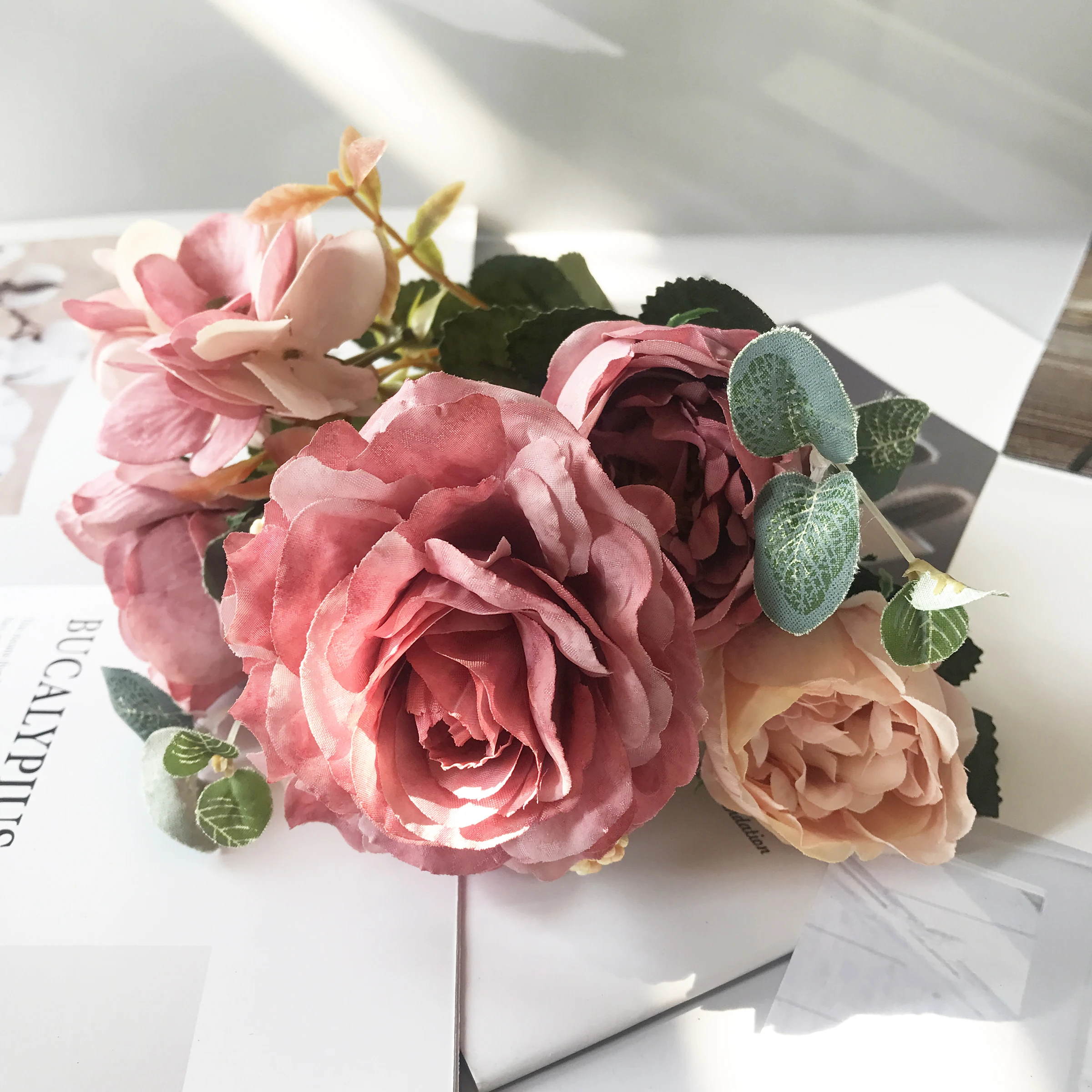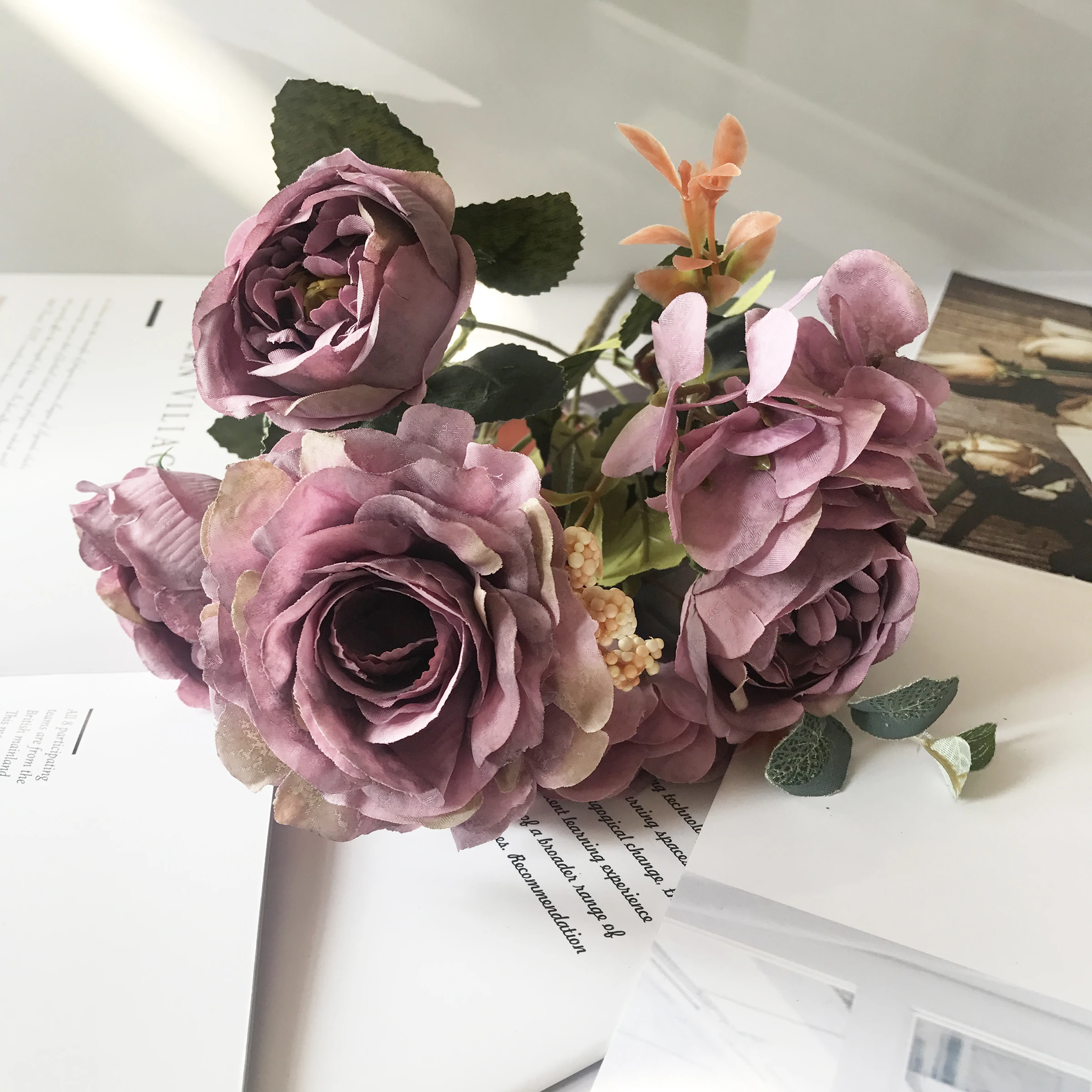 Искусственные цветы, ретро, букет роз из шелка, Гортензия, пион, Винтаж, невеста, в руках, искусственный цветок для дома, свадебные украшения, аксессуары