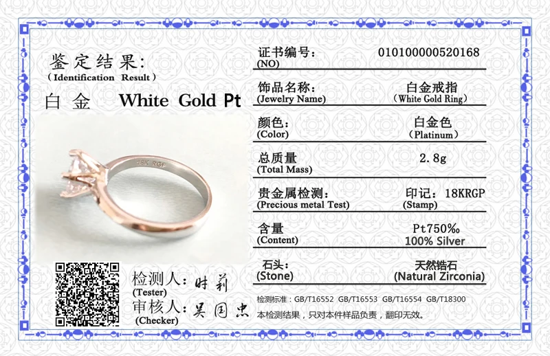 С сертификатом, производство Китай, 18 К кольцо из белого золота 2....