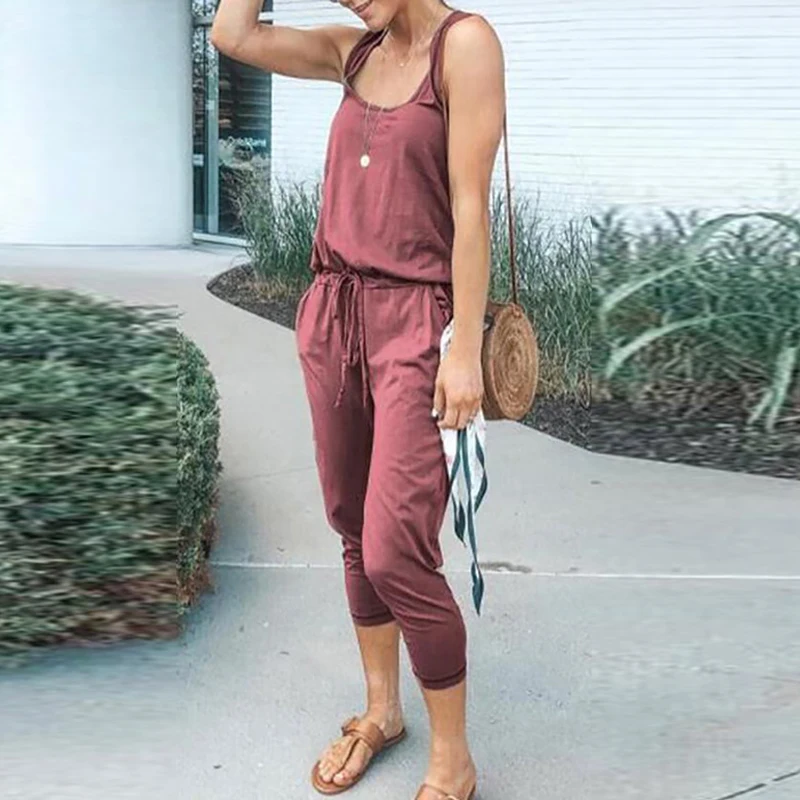 Комбинезон женский без рукавов с открытой спиной, повседневный Ромпер на бретелях с ремни на шнуровке карманами, Летний комбинезон
