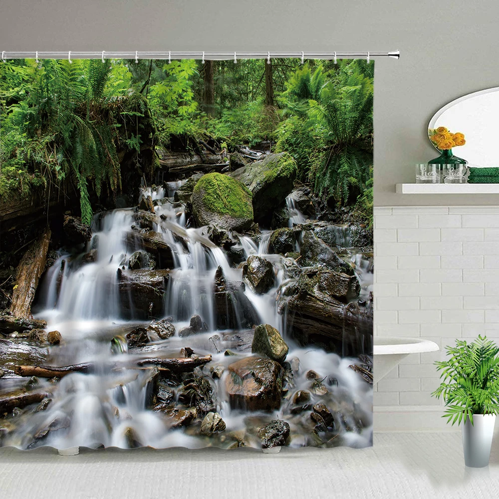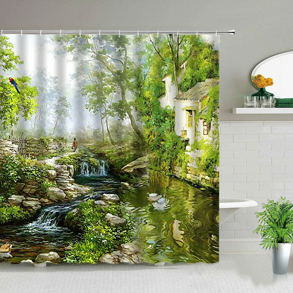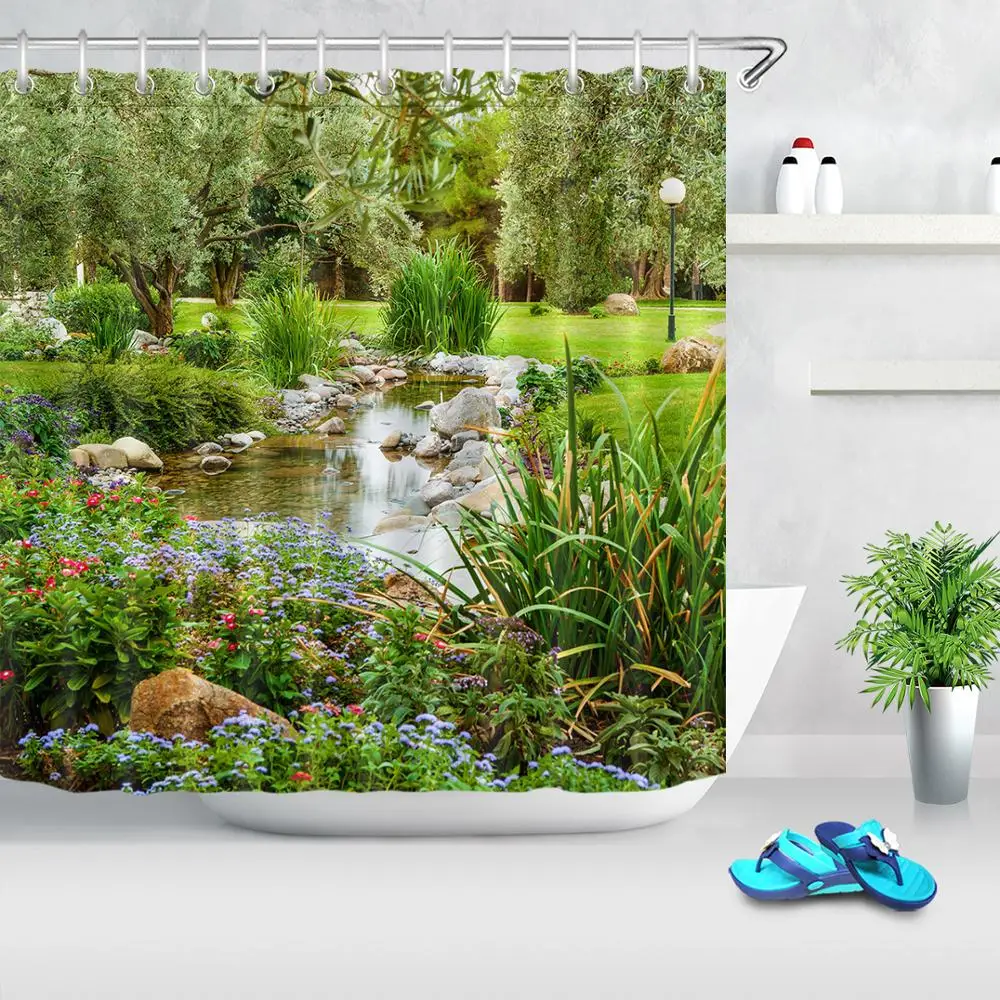 Занавеска для душа из полиэстера, водонепроницаемая тканевая Штора для ванной комнаты, сада, дерева, цветов, пруда, природного ландшафта