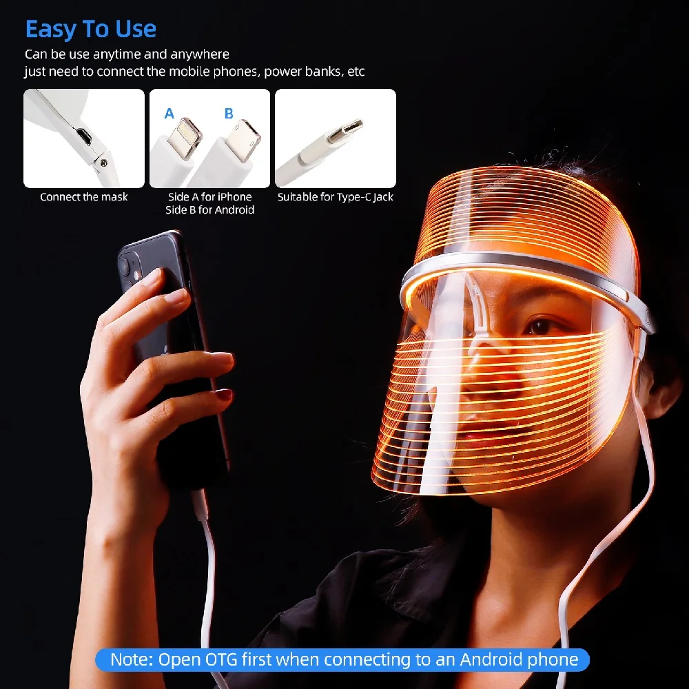 Характеристика Светодиодный фотон-терапия, удобный теплый светильник. Технология нано-складной светильник: это не прямой светильник. Он принимает дизайн нано-складной светильник, а цветной светильник нежный и не повреждает глаза и не влияет на внешнюю линию зрения. Можно подключить к вашему iPhone, ПК и компьютеру с двумя usb-кабелями, предлагая вам в любое время. 3 спектроскопия с большой длиной волны: трехцветный спектр волн играет важную роль. Маска безопасна для кожи, оправа позволяет носить ее стабильно и комфортно. Слепой открытый сенсорный переключатель: Нет необходимости снимать крышку кнопки управления, выберите режим photon beauty только нужно прикоснуться к нему, чтобы контролировать.