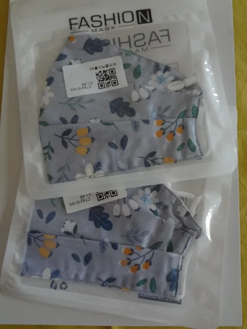 Доставка месяц. Купила за 108,57 руб за 2 шт. Прислали голубые. Хорошая расцветка. На фото она мне не очень нравилась. А в реальность очень приятная оказалась. Маска тонкая, 2-х слойная. Ткань натуральная. С обратной стороны белая. Есть фиксаторы на резиночках, зажимки для носа нет. В них очень легко дышать.