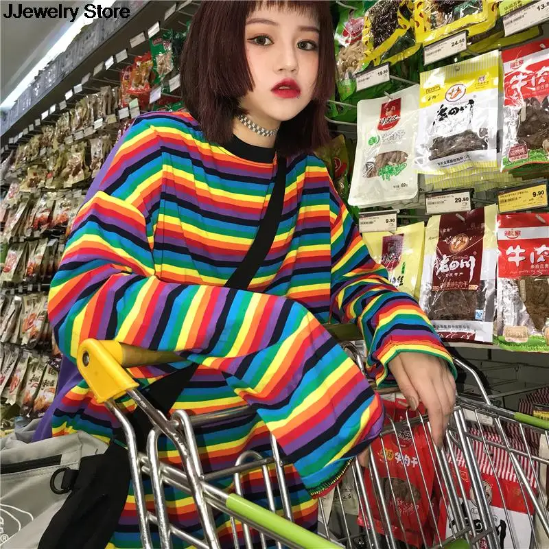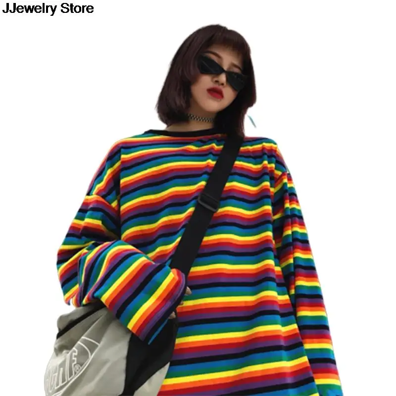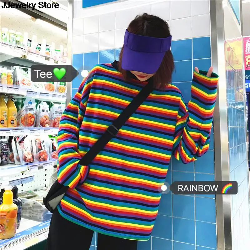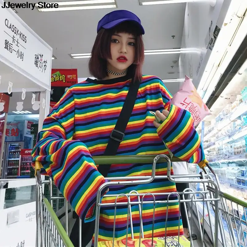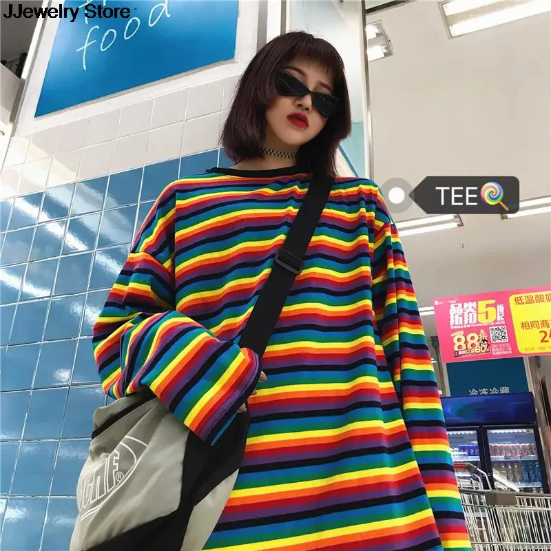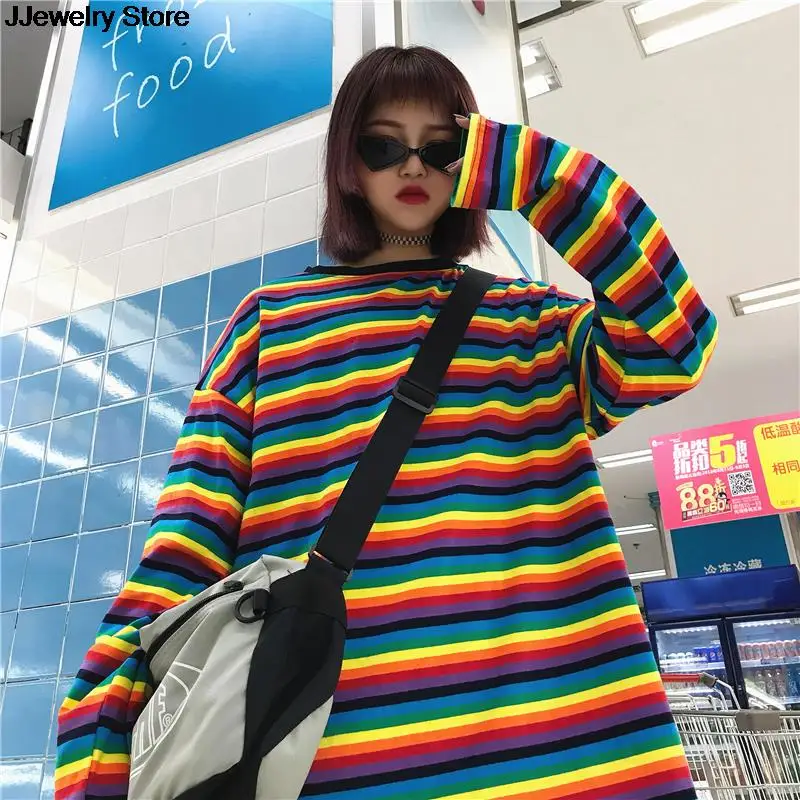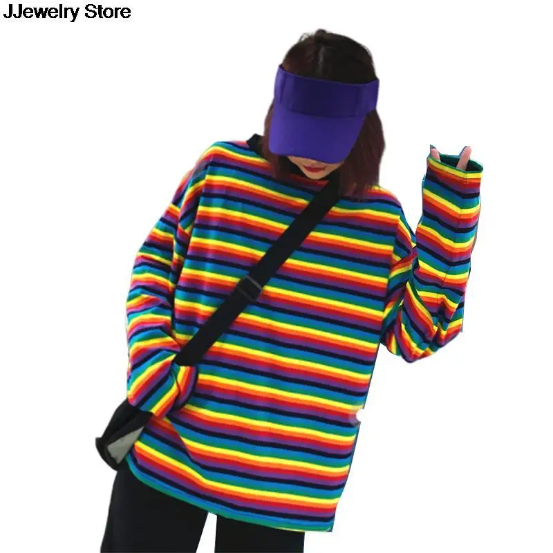 Женская хлопковая футболка, в полоску, свободного кроя, в стиле Харадзюку, в стиле панк, рубашка цвета радуги
