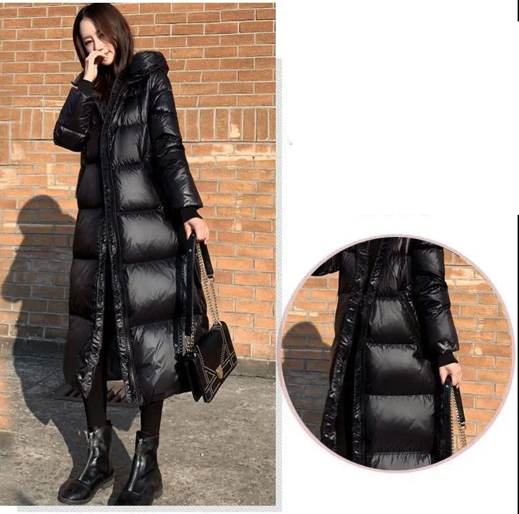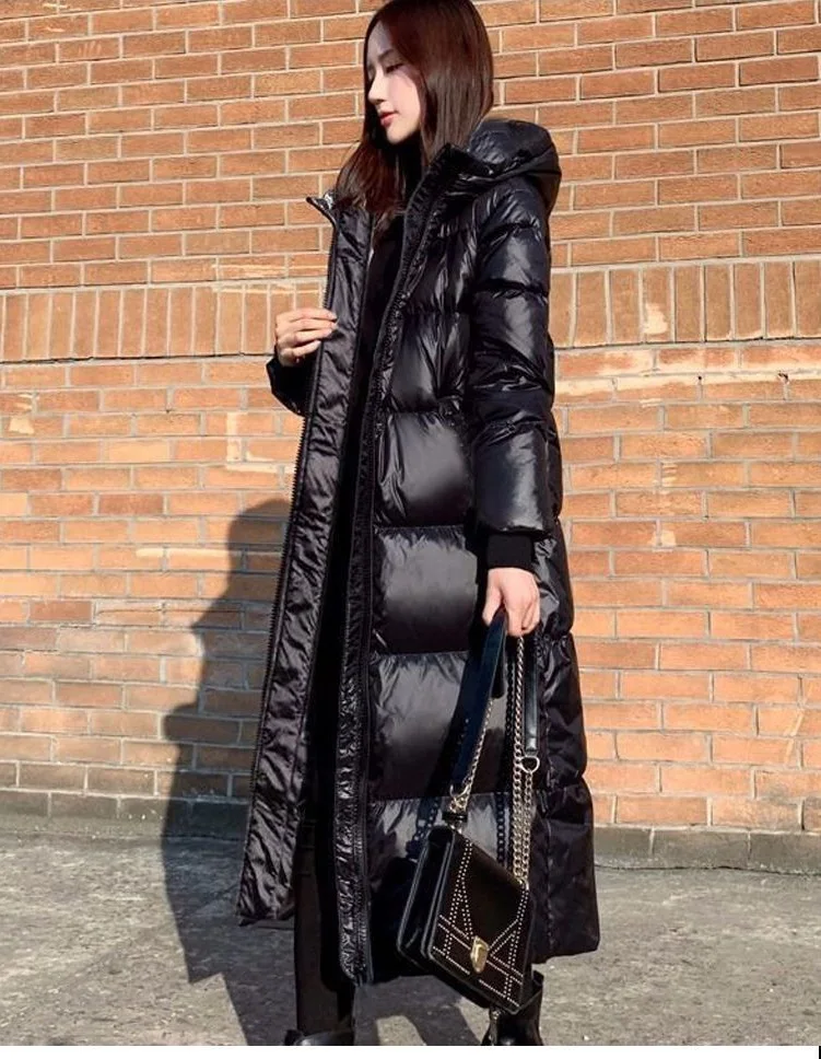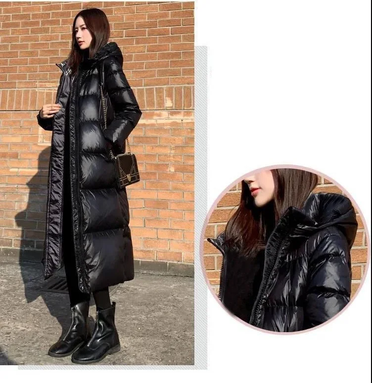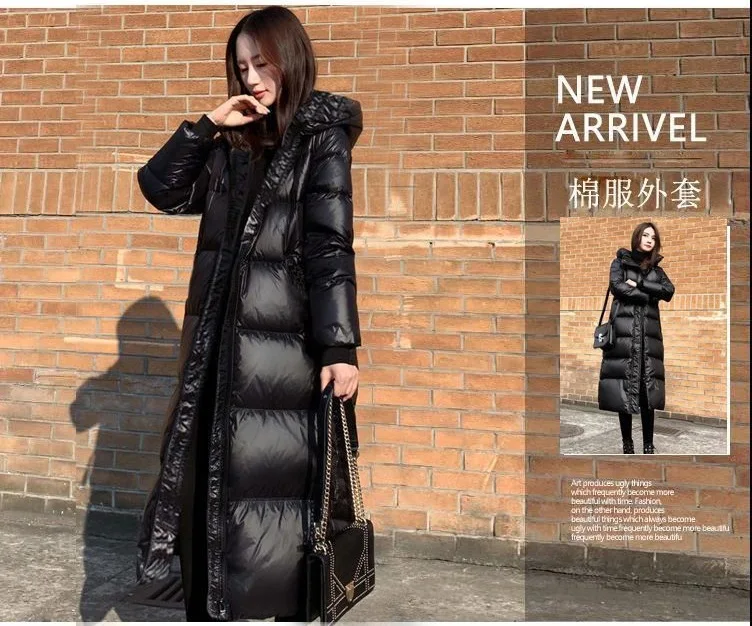 Черная глянцевая парка, Женское пальто 2021, модная Утепленная зимняя свободная длинная куртка с капюшоном, Женская ветрозащитная непромокаемая теплая верхняя одежда