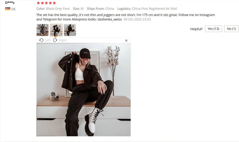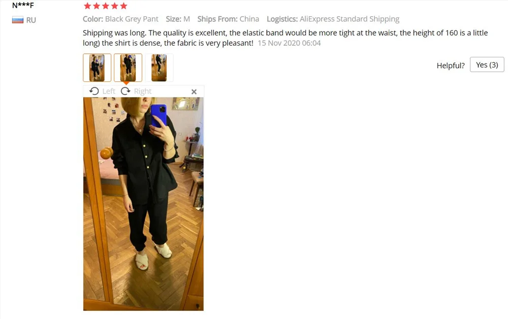 Костюм просто вау!! Сначала заказала бежевый у этого же продавца, а потом на чёрный была отличная скидка 15$.. я не удержалась заказала ещё и чёрный, который пришёл даже быстрее бежевого) Он великолепен, рубашка и брюки отлично комбинируются с другими вещами!!