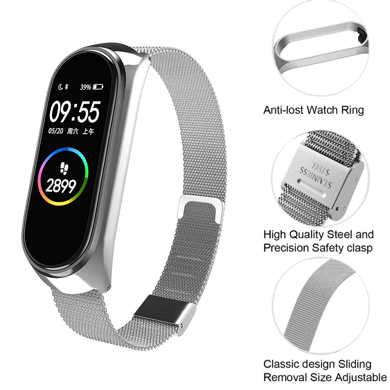 Полированная Металлическая поверхность и прочный ремешок из нержавеющей стали премиум-класса идеально подходят для вашего ремешка mi band 5/4/3.