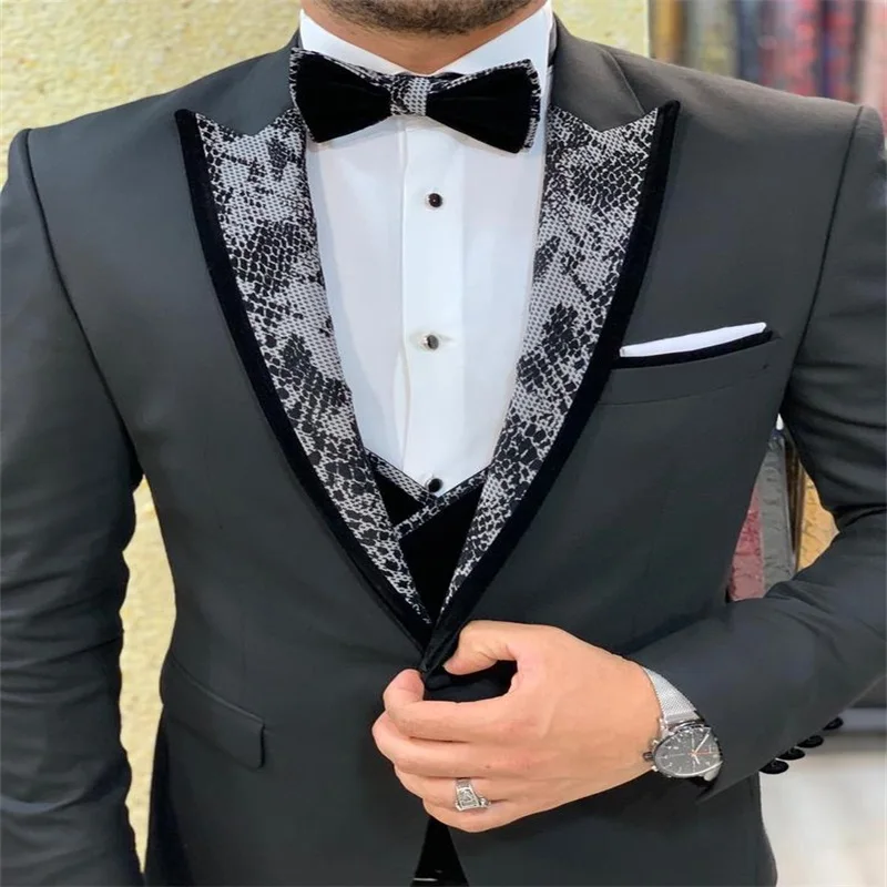 Мужские костюмы со змеиным принтом, черные деловые костюмы из 3 предметов, свадебные костюмы на заказ, современные королевские красивые деловые костюмы с лацканами и брюки
