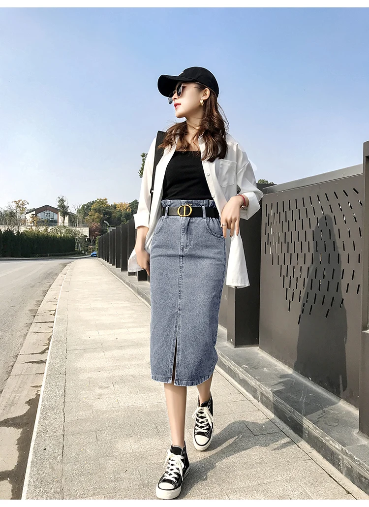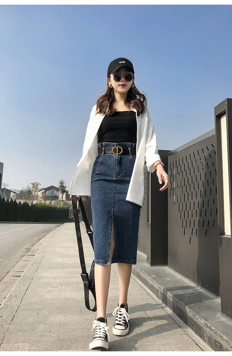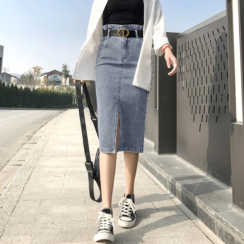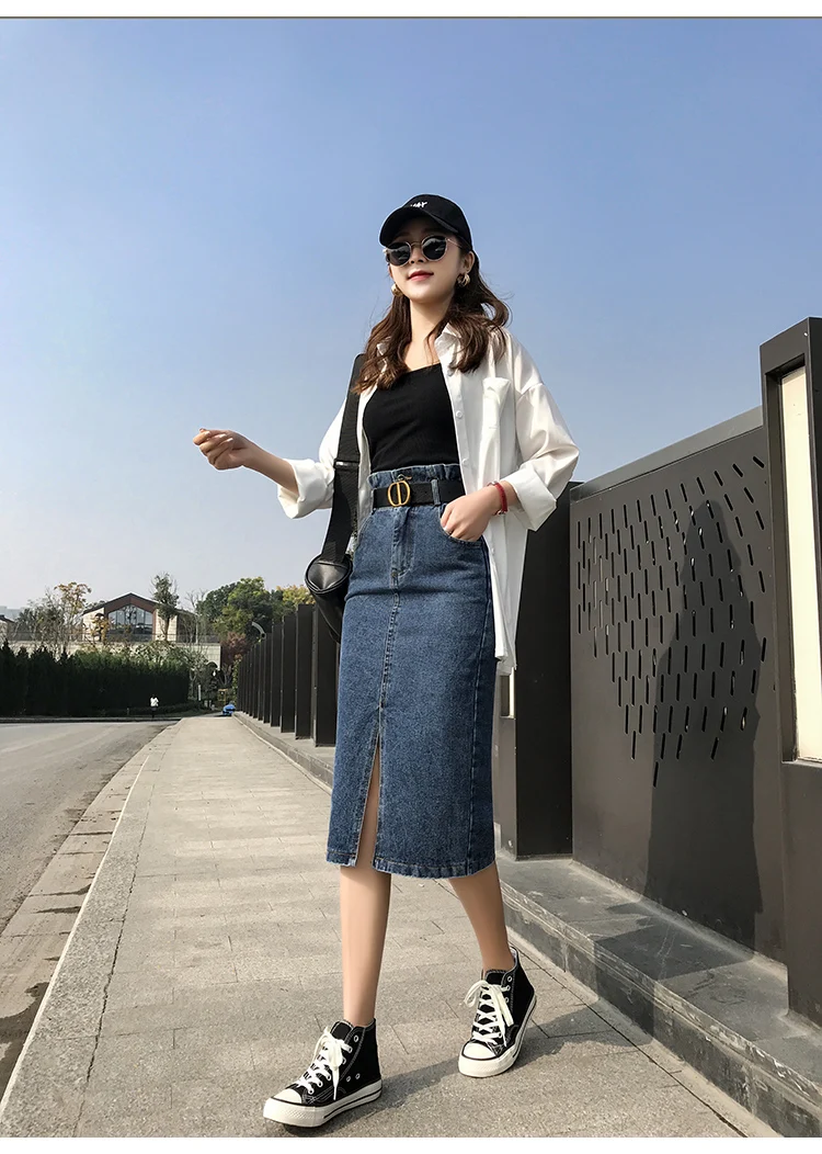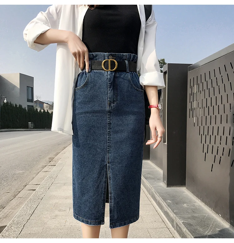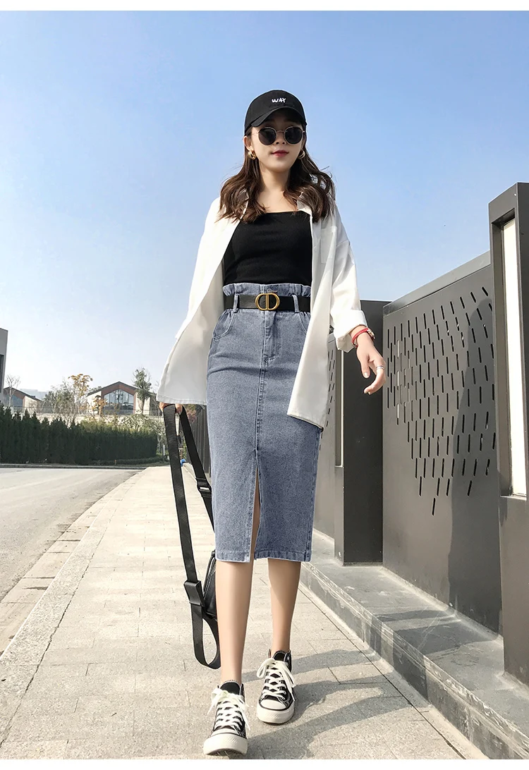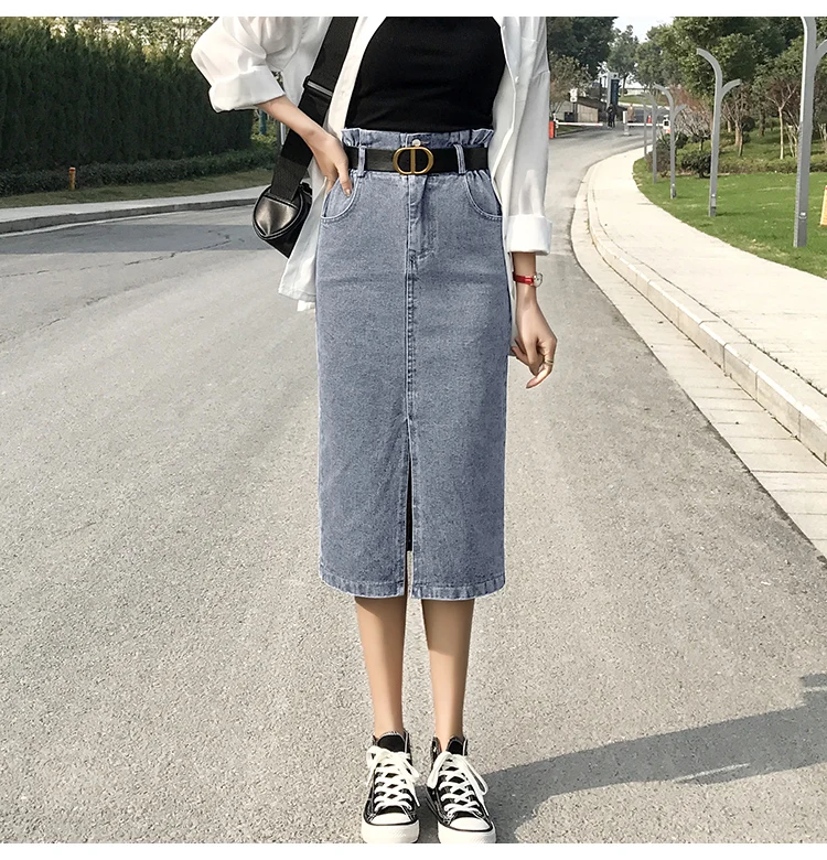 Женская джинсовая юбка с высокой эластичной талией, синяя, черная трапециевидная юбка с ремнем, джинсовая юбка в уличном стиле, Новинка лета 2021