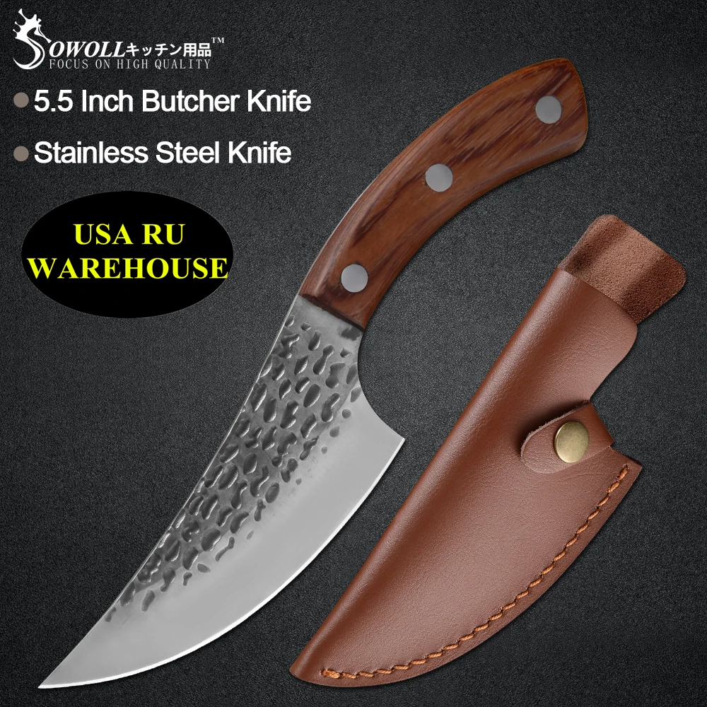 Sowoll 5,5 ''кованый нож для мясника из нержавеющей стали скрепляющий инструмент для охоты и кемпинга кожаный чехол ручной работы нож шеф-повара в сербийском стиле