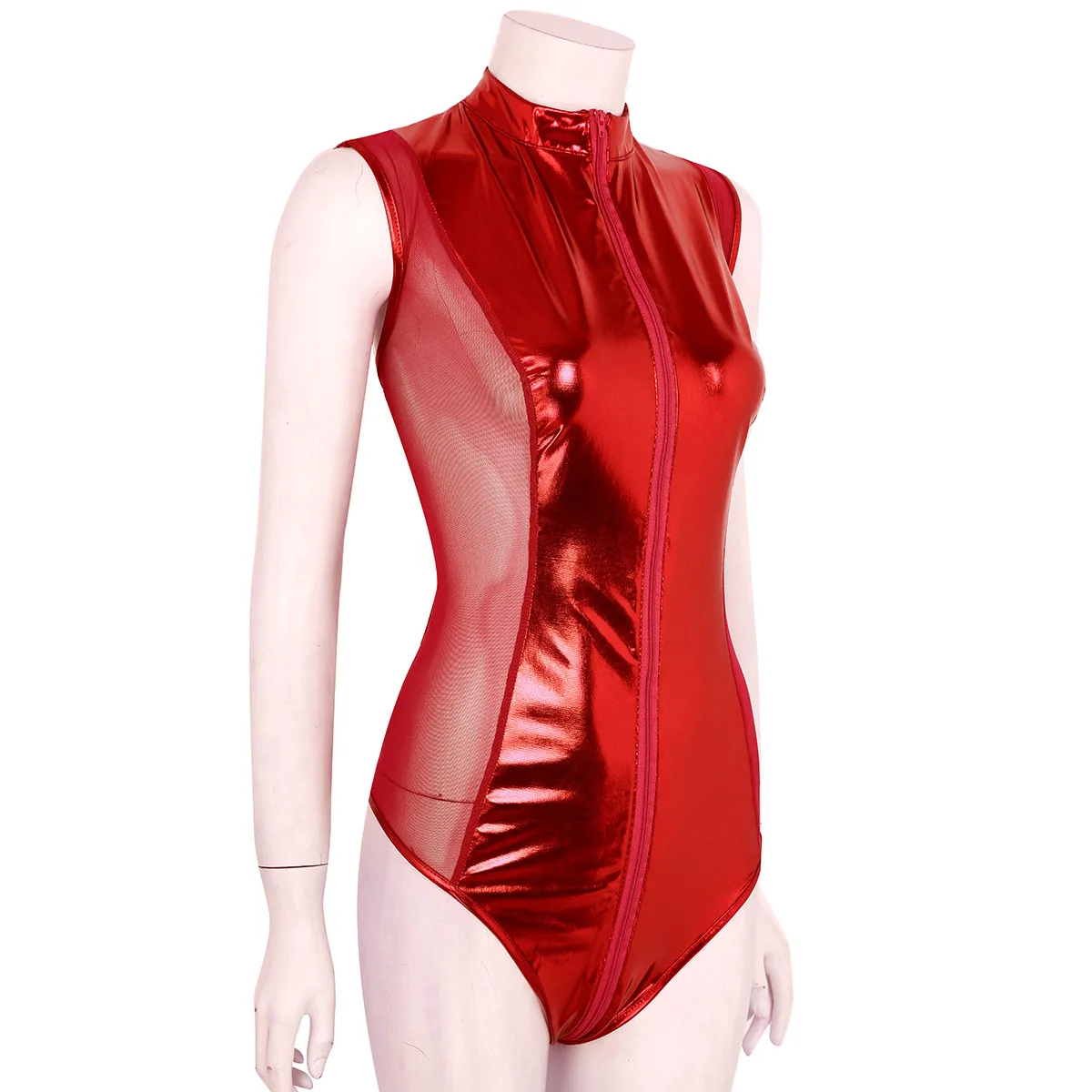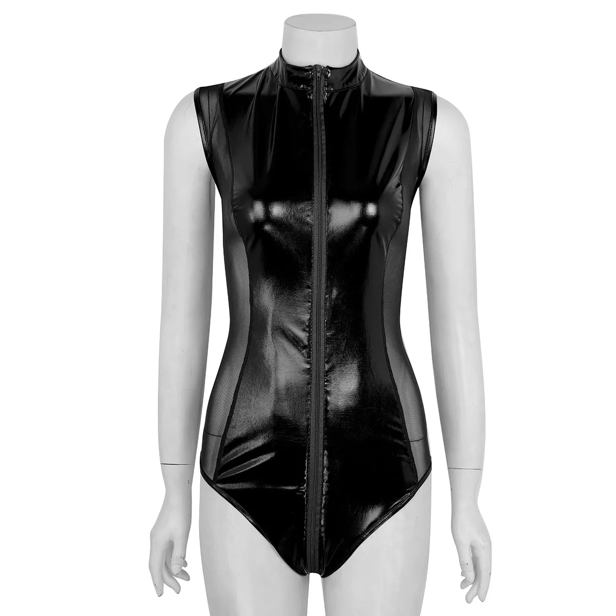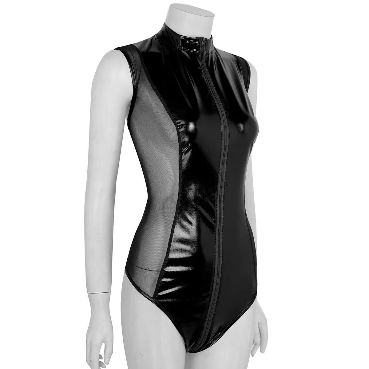 Женское блестящее латексное нижнее белье с металлическим блеском, костюм-кошка, сетчатые кожаные сексуальные костюмы, Клубная одежда, стринги на молнии с открытой промежностью и высоким вырезом, секс-боди