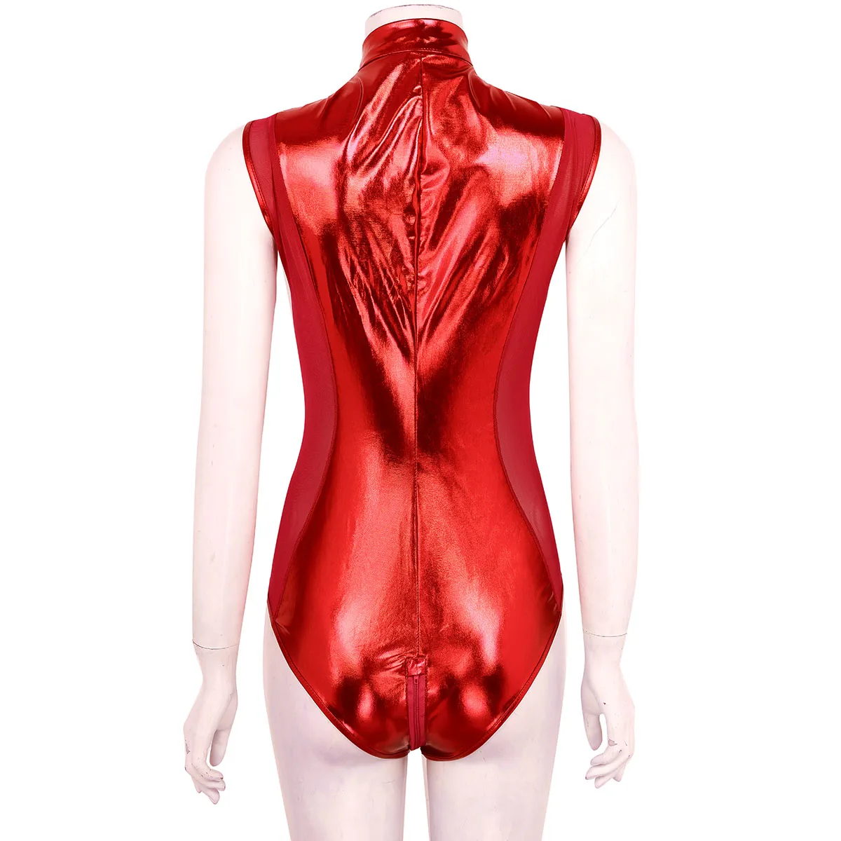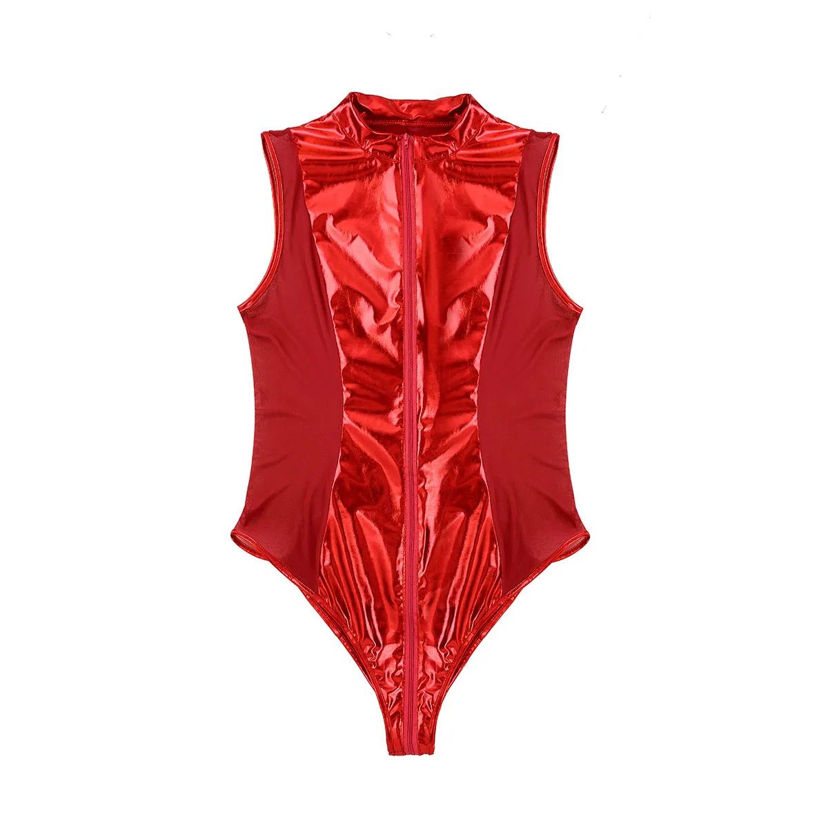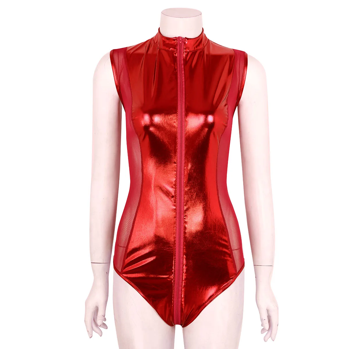 Женское блестящее латексное нижнее белье с металлическим блеском, костюм-кошка, сетчатые кожаные сексуальные костюмы, Клубная одежда, стринги на молнии с открытой промежностью и высоким вырезом, секс-боди