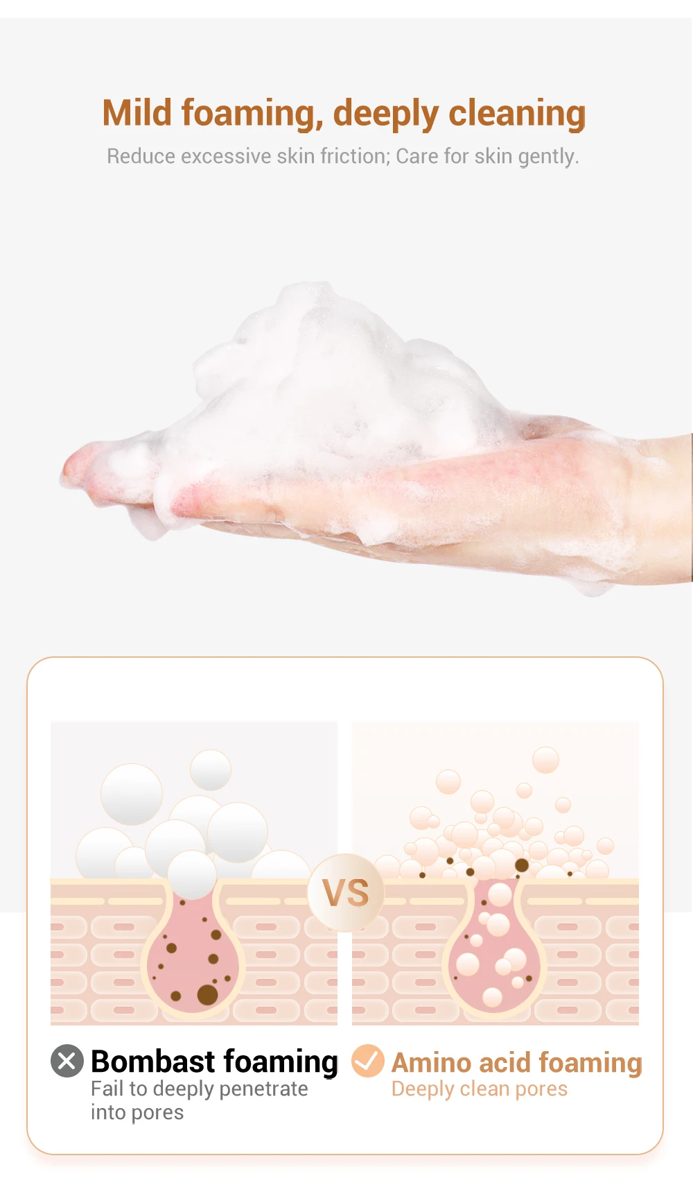 Несколько функций для создания чистой и гладкой кожи Баланс воды и масла Регулирует баланс масла кожи, оставляя кожу обновленной, увлажненной и эластичной. Плотная пена Тонкая молочная текстура-гладкий и светильник, придающий коже нежность и прозрачность. Мягкое очищение Аминокислоты мягко очищают поры, оставляя кожу увлажненной и мягкой.