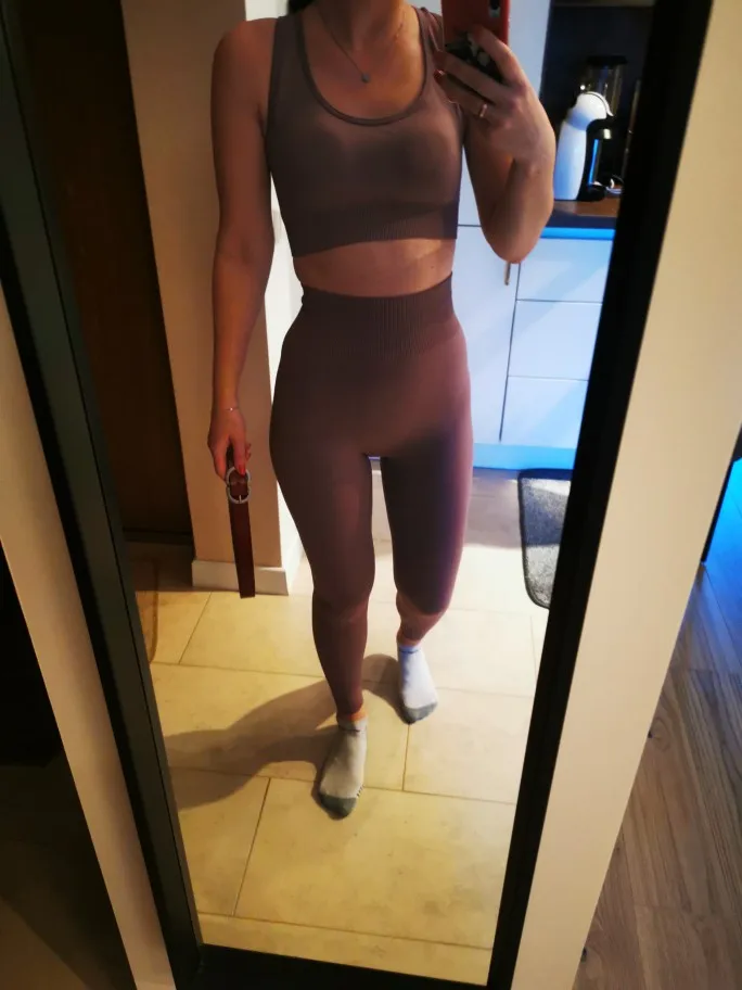 Топ большой, но леггинсы в порядке. Размер L подходит только для девочек с большой грудью.