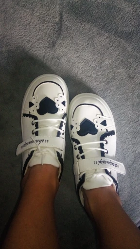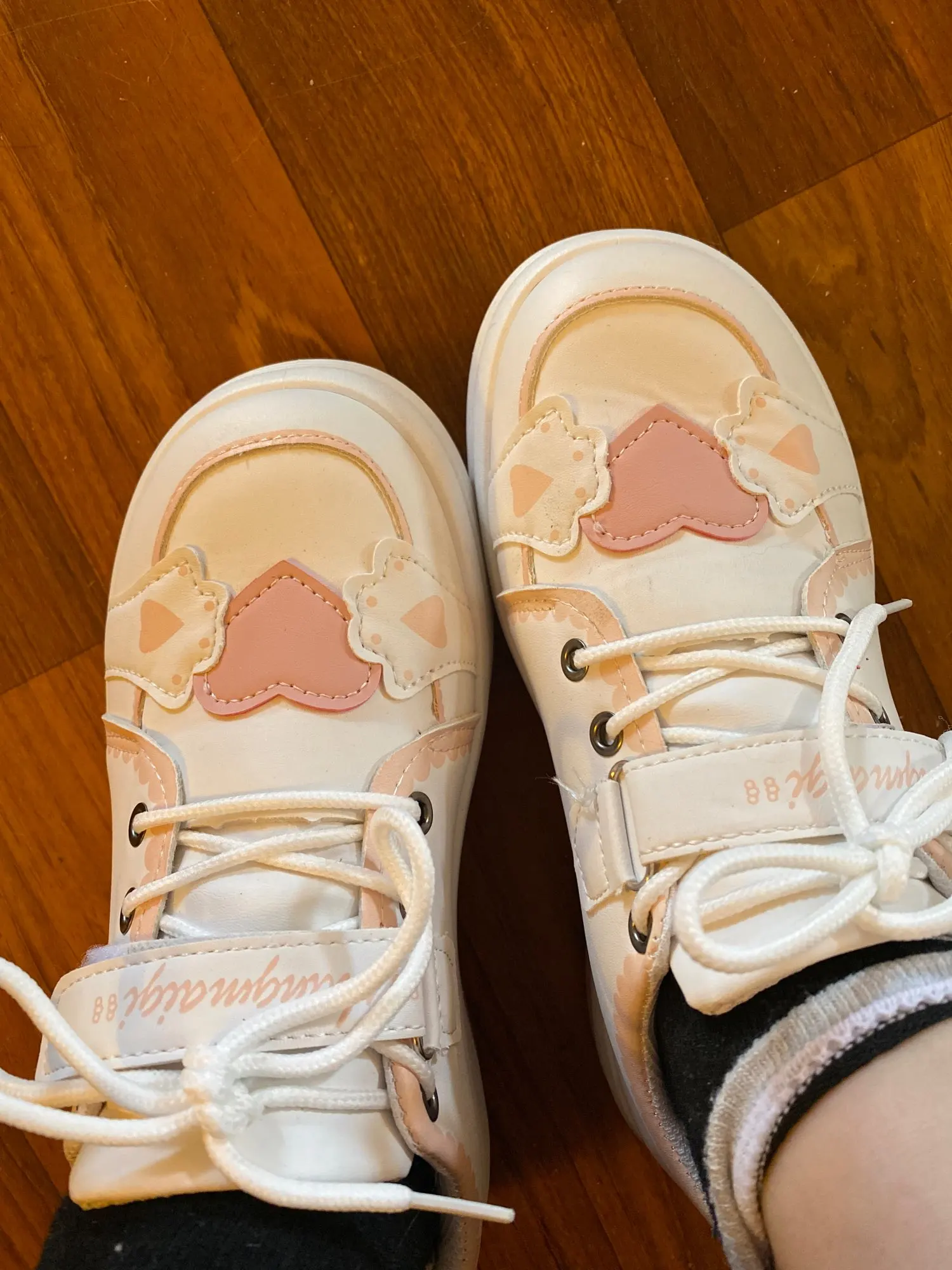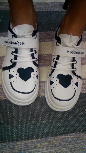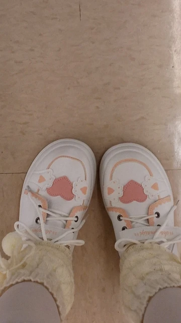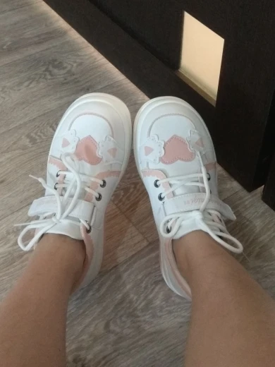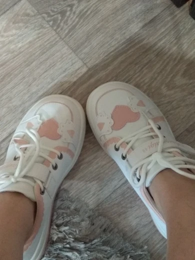 Я так доволен этим, они такие милые ^ Обувь прилично весит, как пара кроссовок {for ref air force 1s ish} подошва не такая, как я ожидал, как показано на второй фотографии, есть дизайн клавиатуры, и мне это нравится. Обувь складывается довольно легко, но это не мешает сердцу. Обычно я американский размер 7,5 и использую руководство по размерам, я получил 39, но они немного вместительные. Я рекомендую размер вниз, если вы находитесь между двумя размерами. Цвет отделки больше абрикосового оттенка, а Сердечко-Милого Розового цвета. 10/10 рекомендуется <3