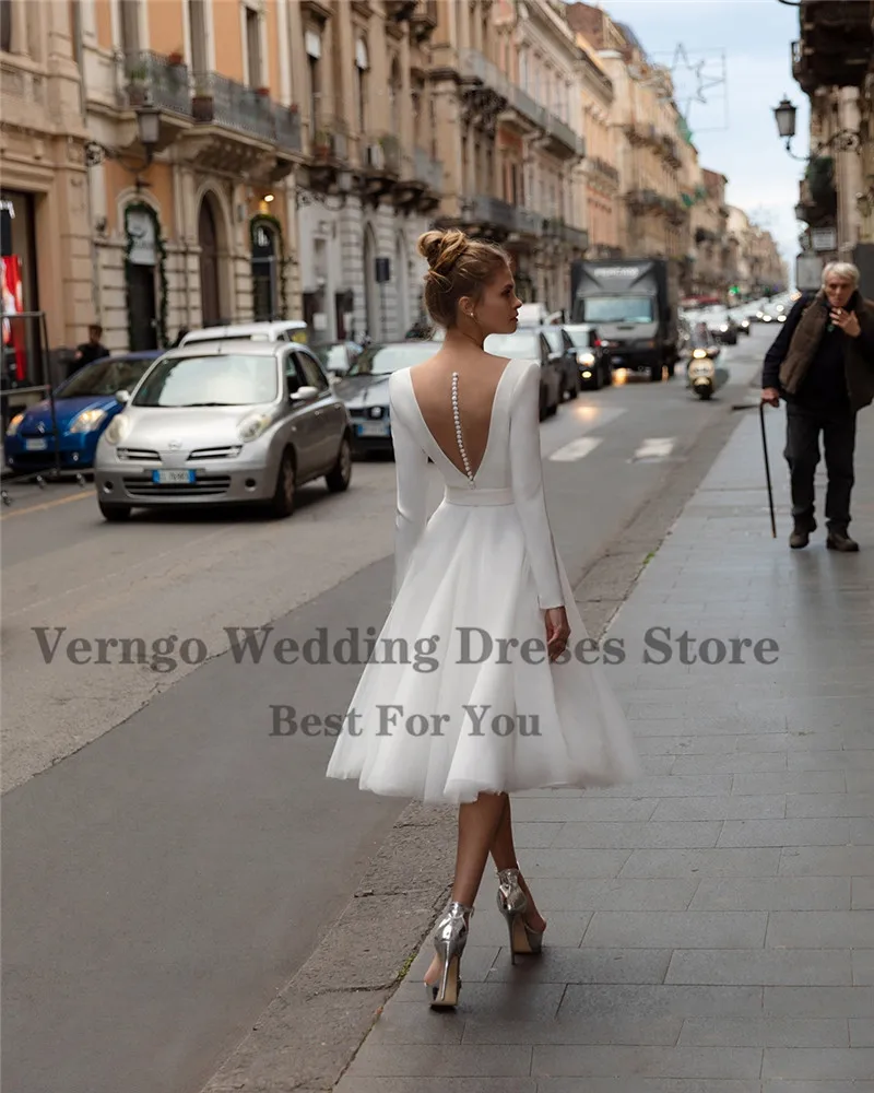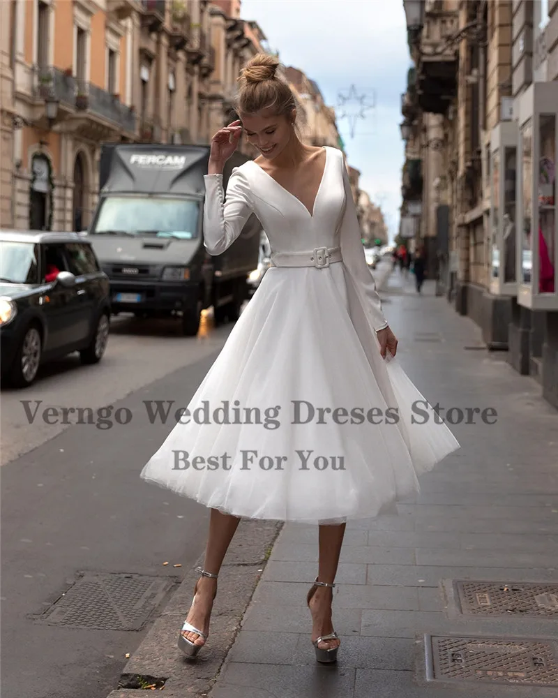 Простое Короткое свадебное платье-трапеция Verngo 2021 с длинным рукавом и V-образным вырезом, Мягкая атласная и Тюлевая юбка, свадебное платье длиной ниже колена, женское платье
