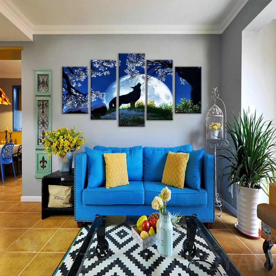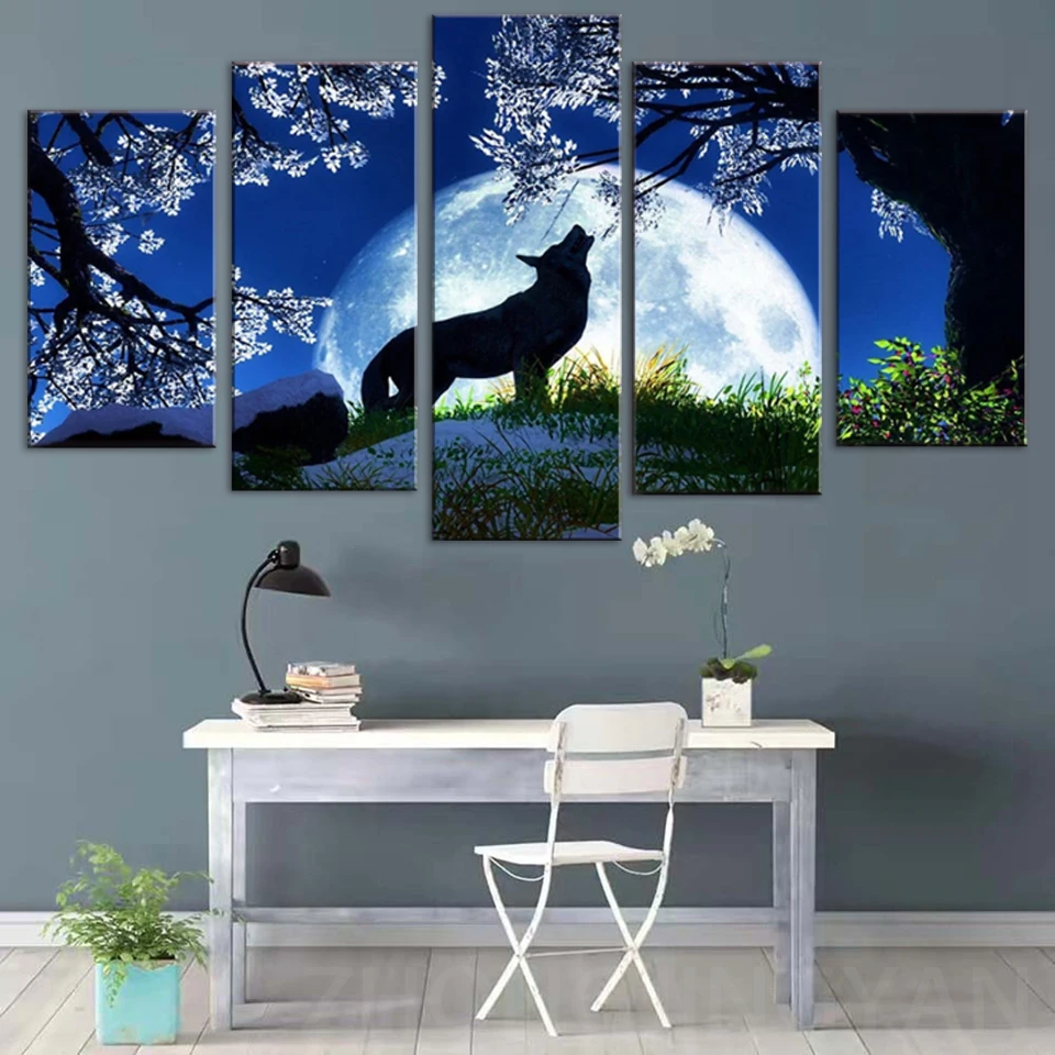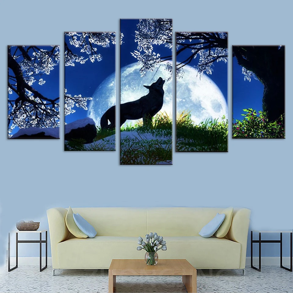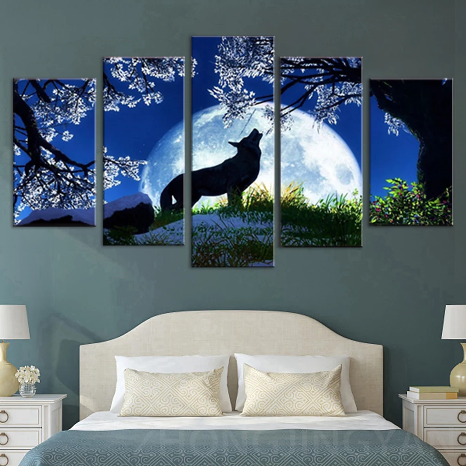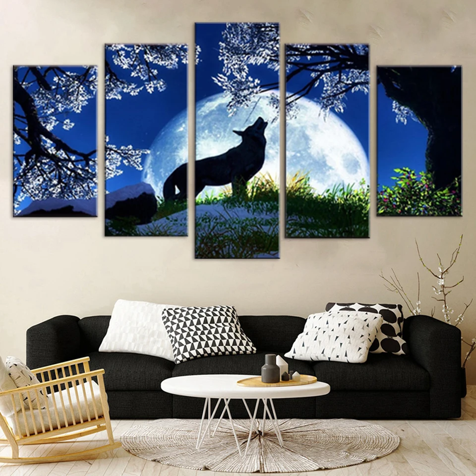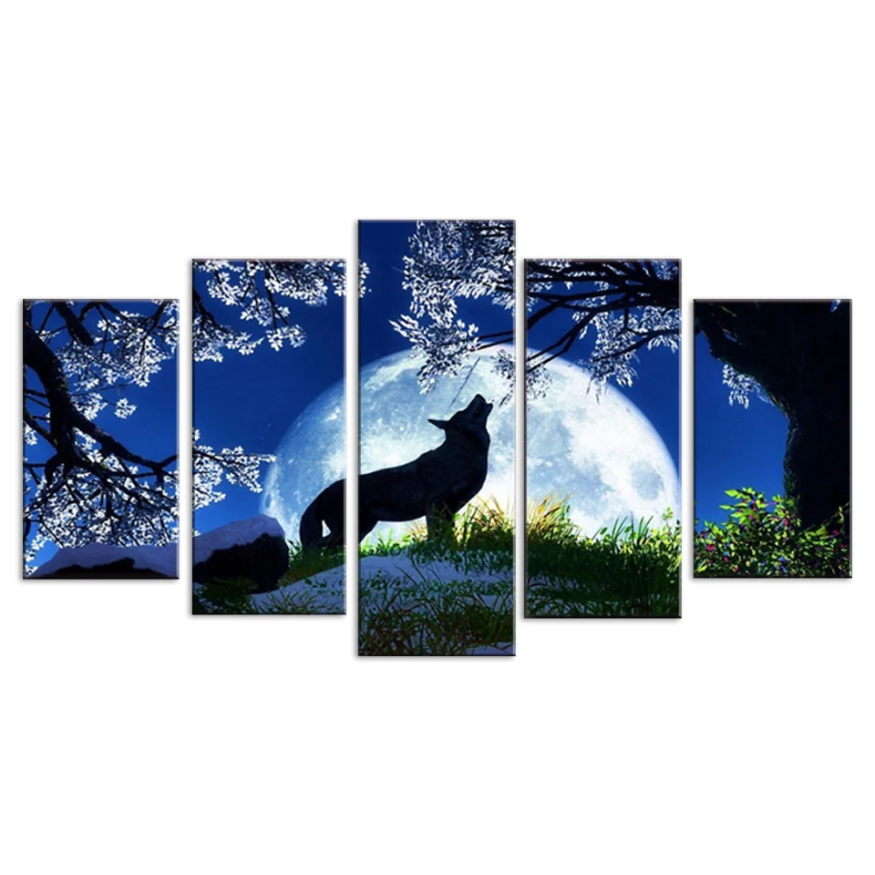 5 шт., картины на холсте с изображением животных воющего волка, голубой луны, цветков вишни