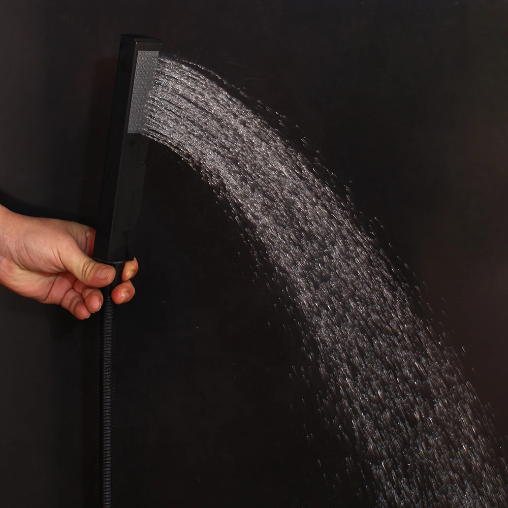 Функция: набор душевых смесителейМатериал корпуса: твердая латуньМатериал головки: нержавеющая стальМатериал ручного распыления: АБС-пластикОтделка: черная живописьКоличество ручек: 1 ручкаРазмер квадратной головки: 8 "200 мм/10" 250 мм/12 "300 мм/16" 400 мм2 и 3 функциональный клапан управления смесителем водыДуш 200 ммПластиковый ручной душ спрей в комплекте