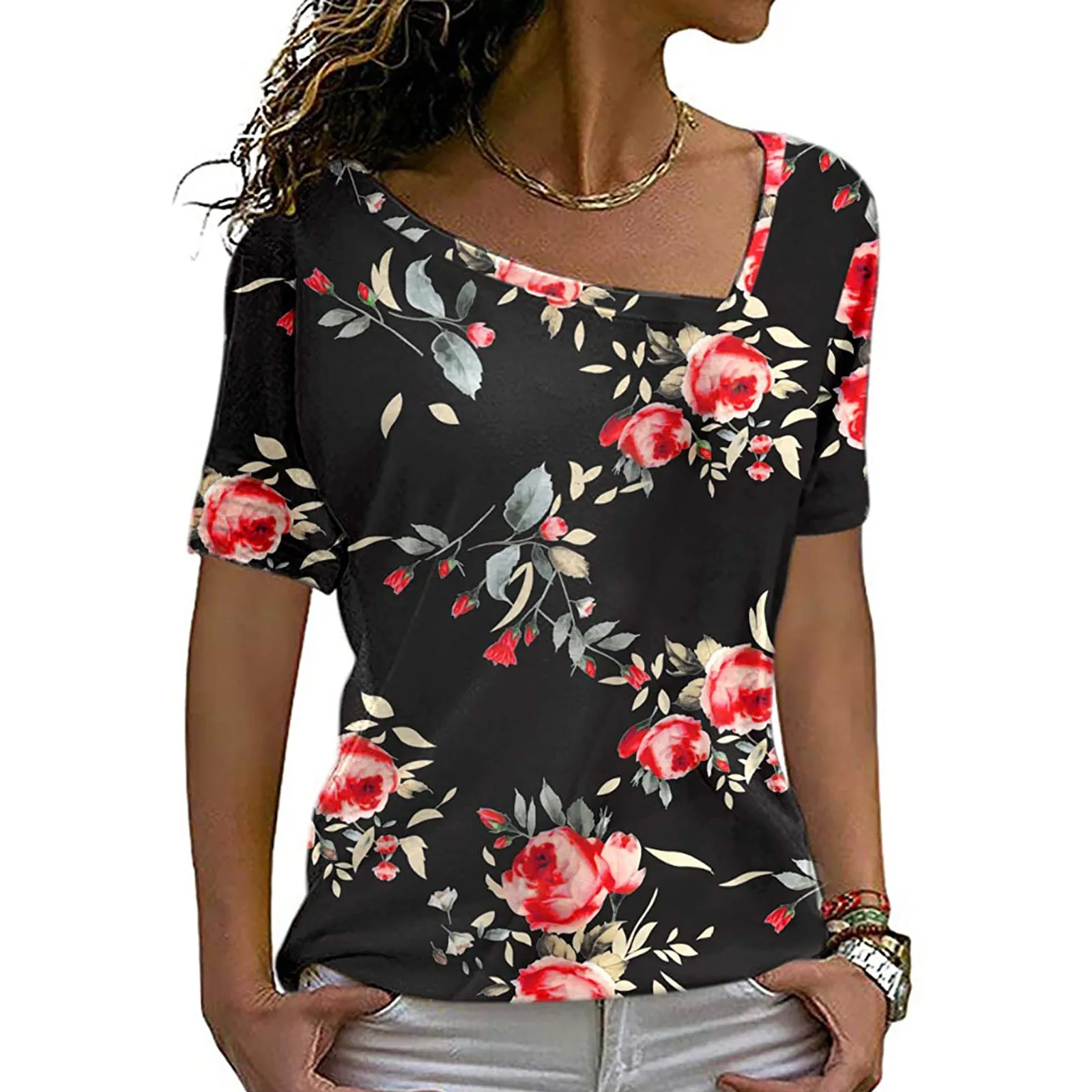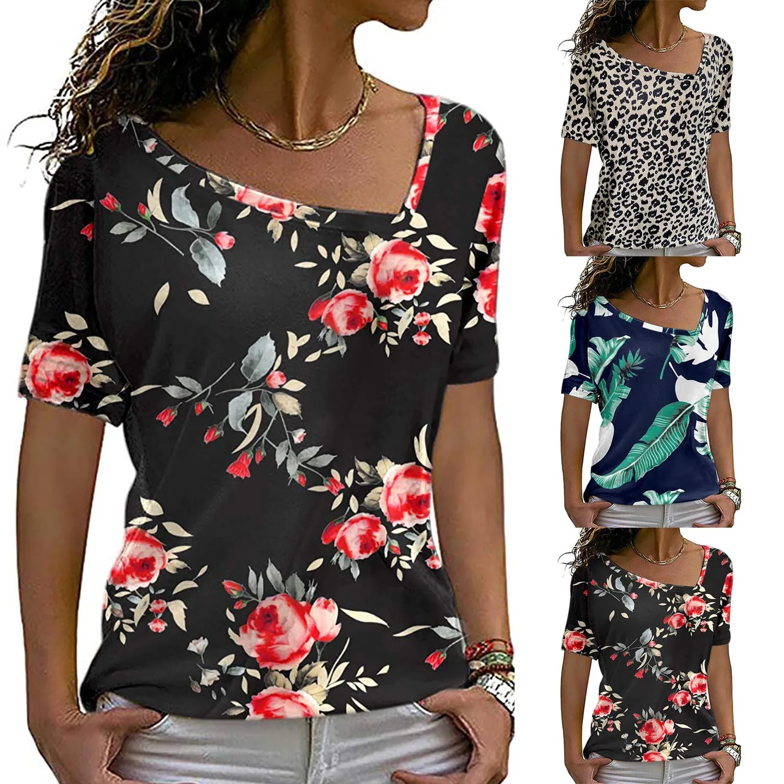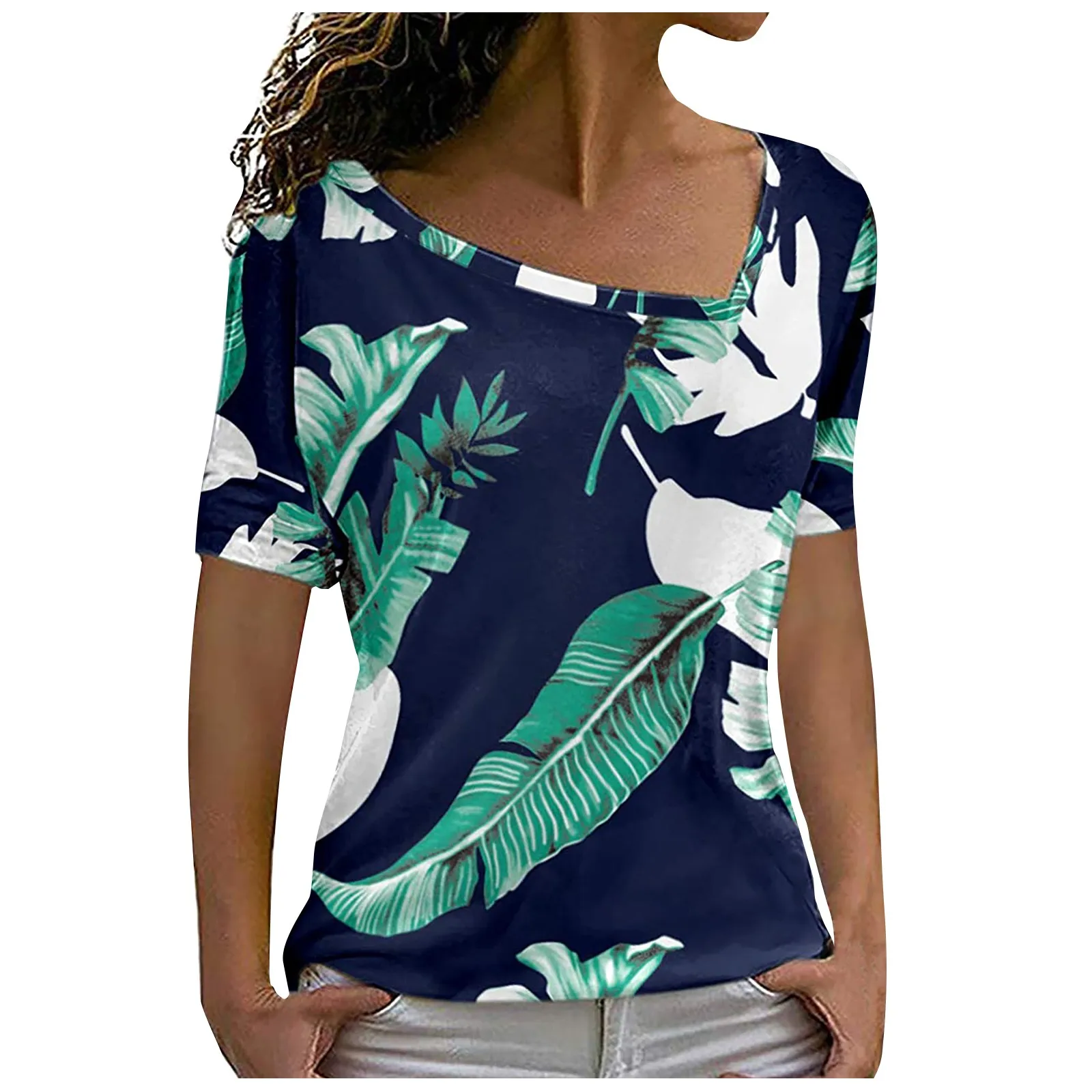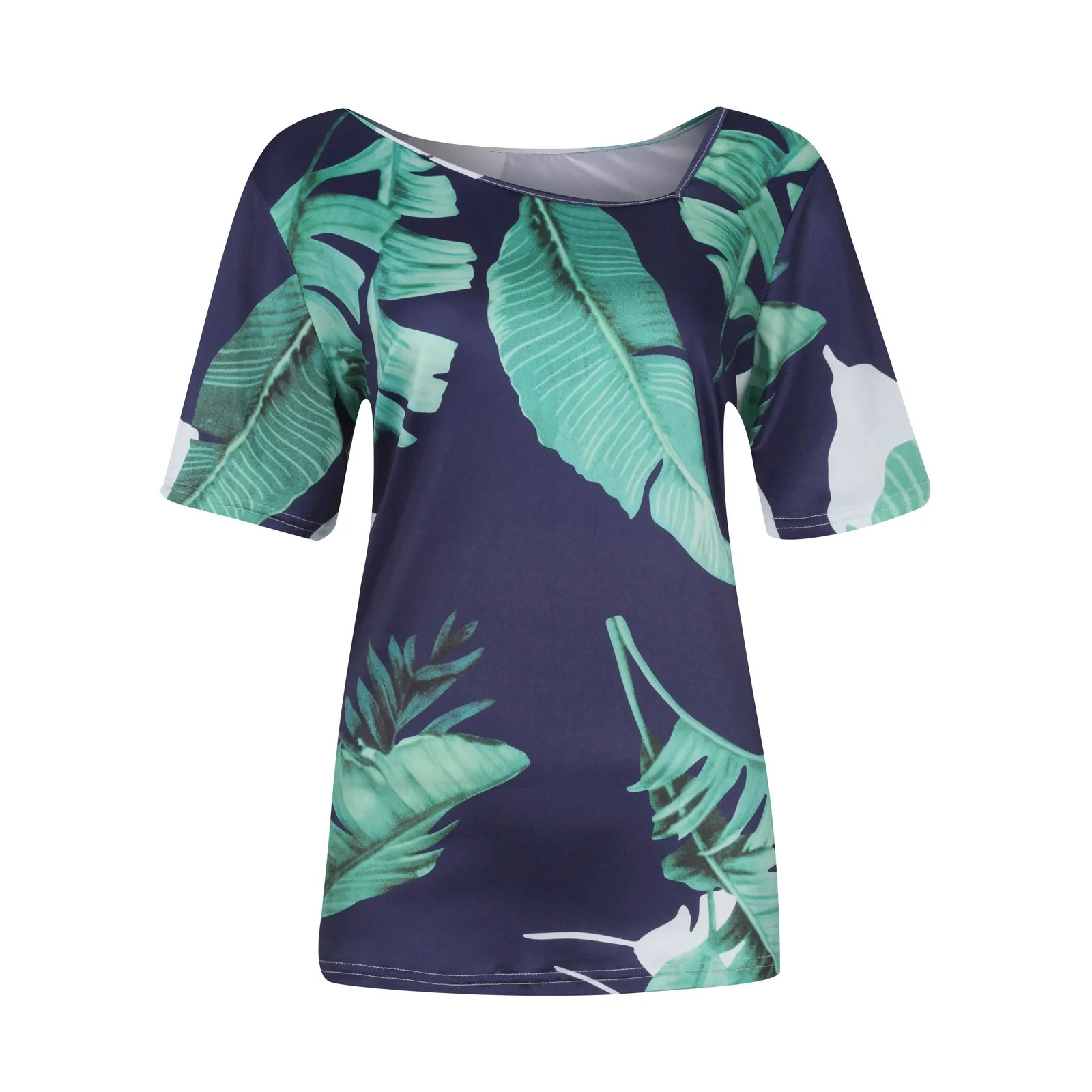 40 # женские футболки, повседневный спортивный костюм с короткими рукавами с принтом свободный крой пляжное Стиль Футболка асимметричного пояс летний топ Рубашка Женская