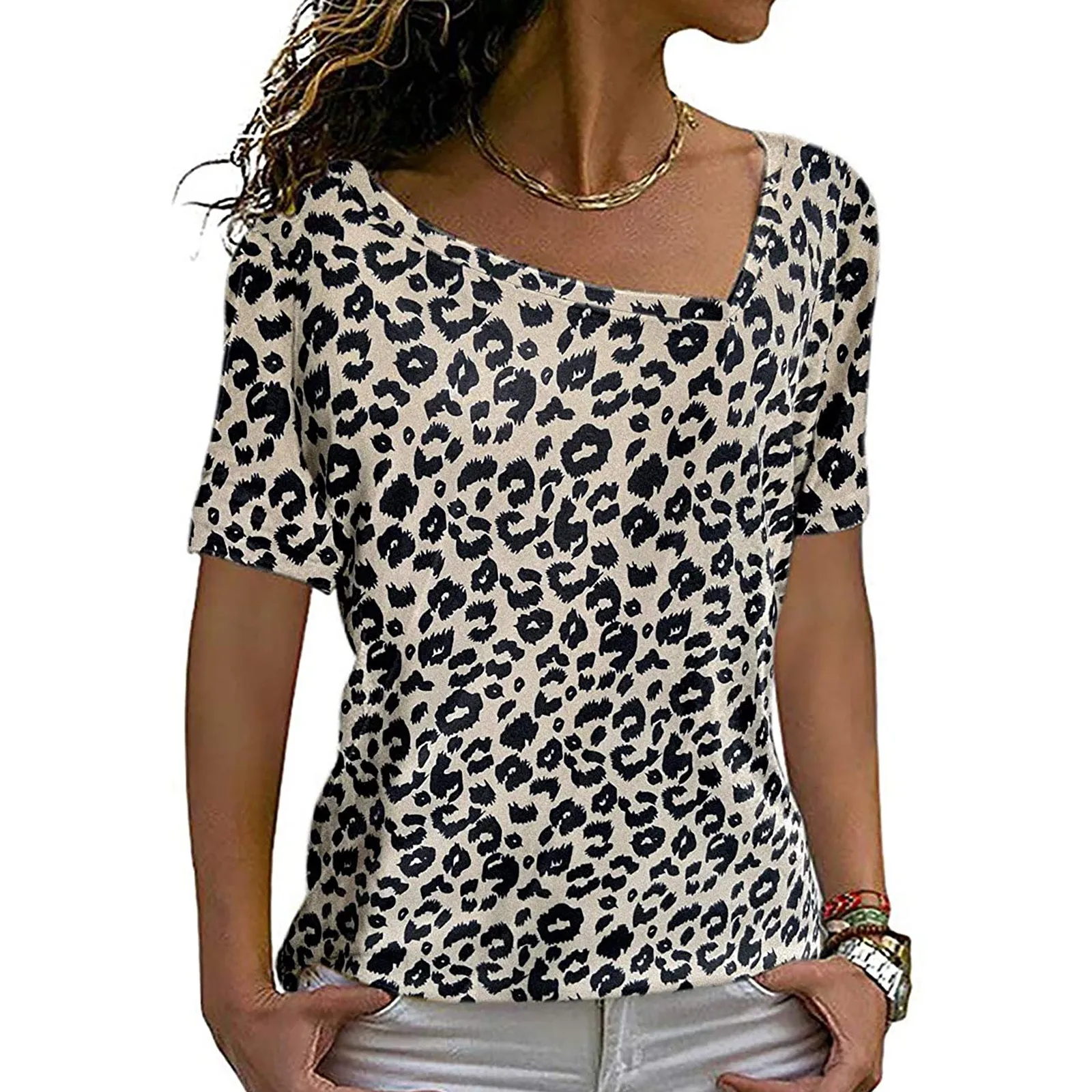 Женская Повседневная футболка с короткими рукавами, свободная рубашка с принтом, топ с поясом
