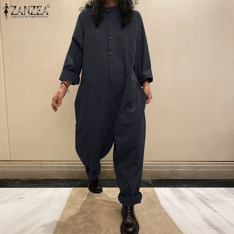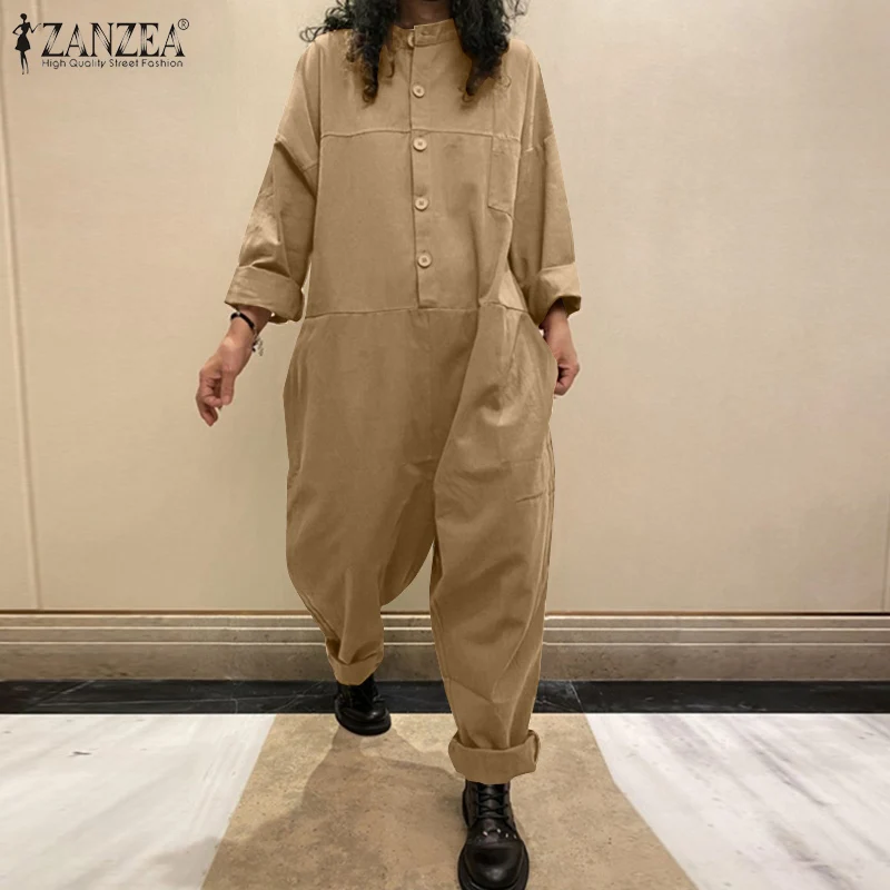 Комбинезон ZANZEA женский с заниженной мотней, винтажный Повседневный ромпер с длинным рукавом, однотонный комбинезон на пуговицах, весна 2021