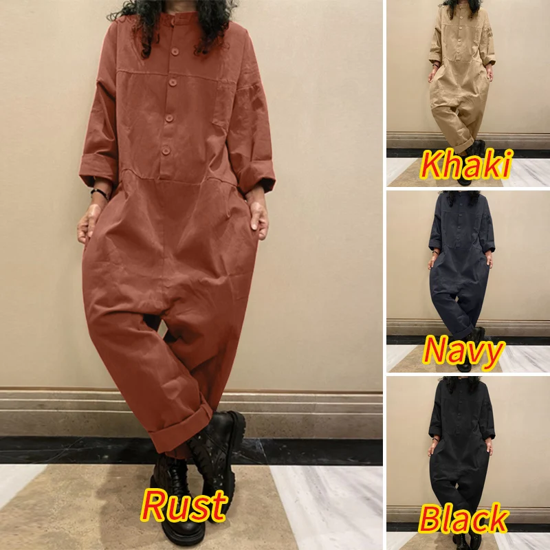 Посылка: 1 комбинезонМатериал: 100% полиэстерЦвета: черный, ржавчина, хаки, темно-синийРазмер: S,M,L,XL,2XL ,,,Длина рукава: полный рукавВырез горловины: воротник-стойкаРисунок: однотонныйДлина: до щиколоткиТолщина: тонкаяУкрашение: боковые карманыОсобенности: комбинезонСтиль: Досуг, богемный, ретро, ЕвропаСезон: весна, лето, осеньПовод: семья, праздник, работа, путешествия