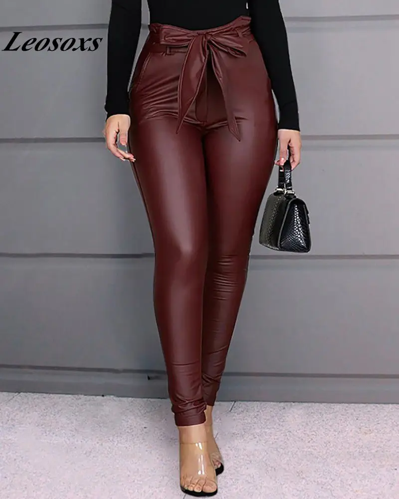 Женские леггинсы из искусственной кожи с завышенной талией и бантом...