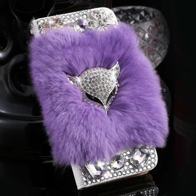 Блестящий кожаный флип-кошелек со стразами и лисьим мехом для Iphon...