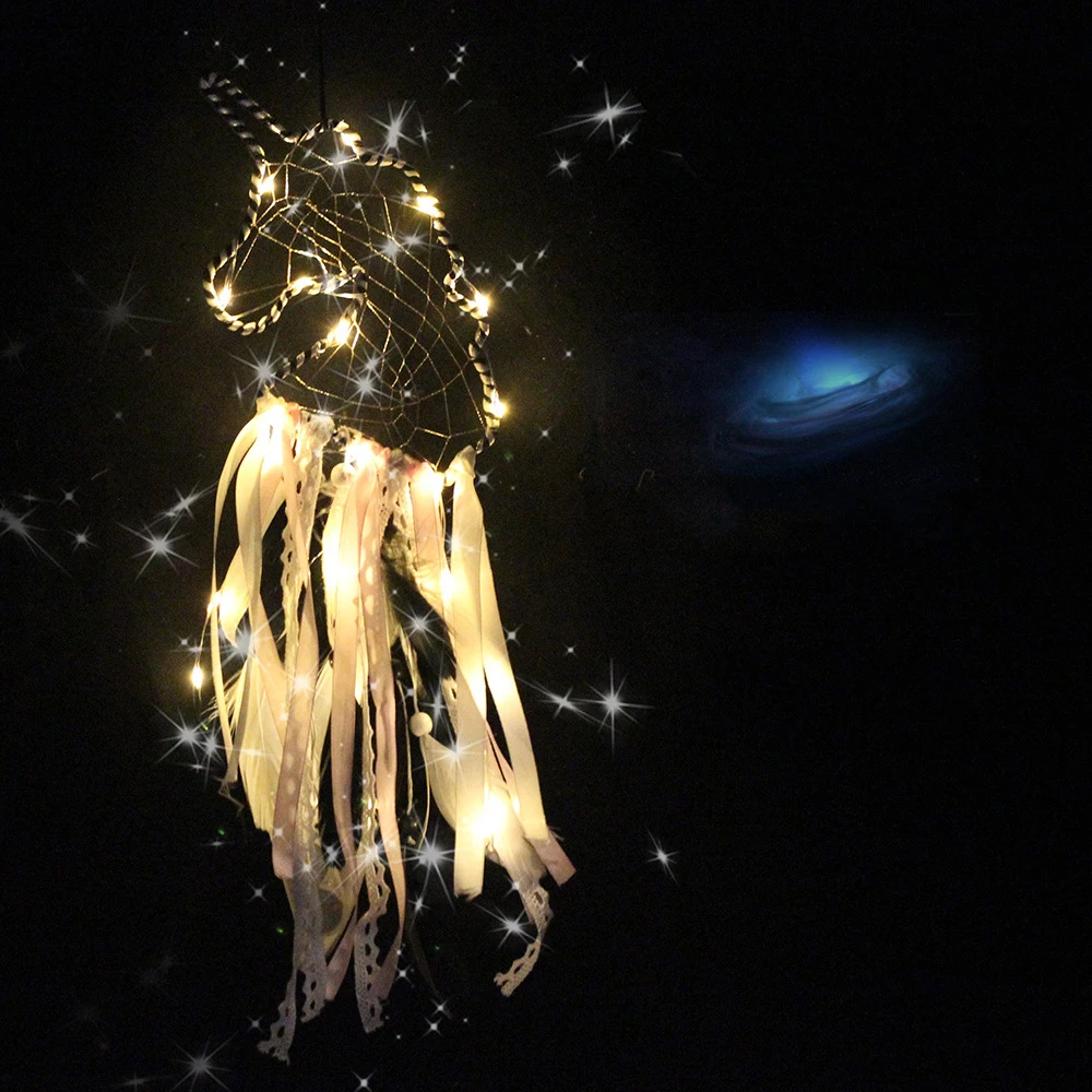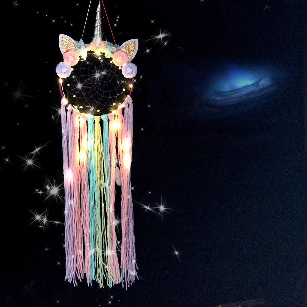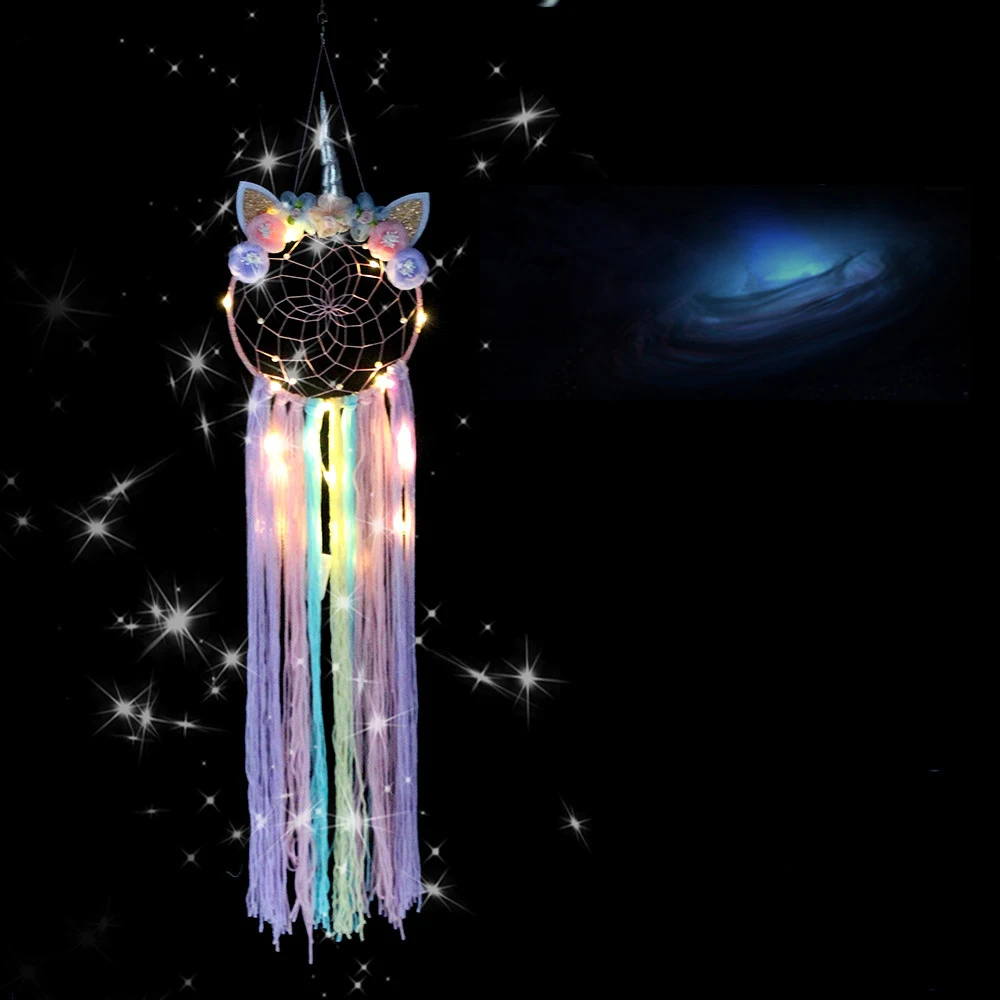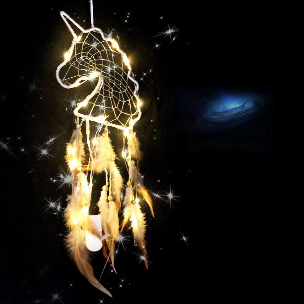 Ветряные колокольчики, настенное украшение, светодиодное освещение, перо, единорог, Ловец снов, украшение для спальни, детской комнаты, девочки