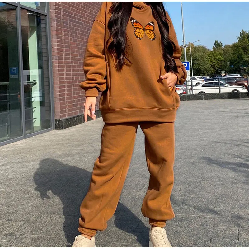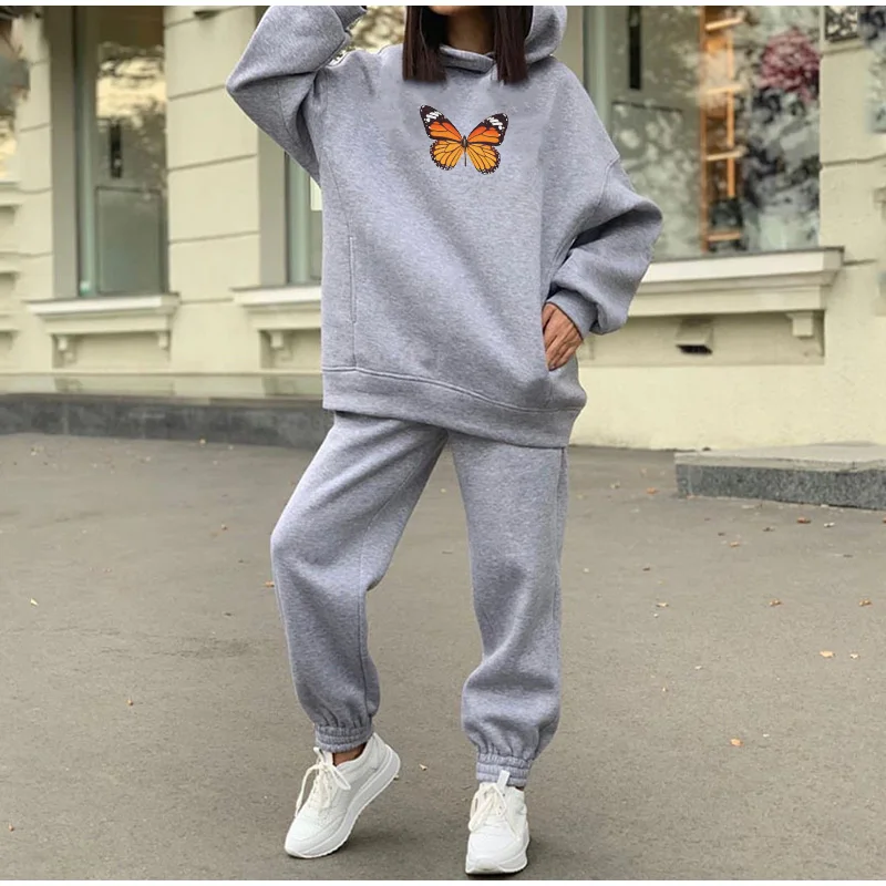 Костюм спортивный женский флисовый с бабочками и штанами, большого размера, весна-осень 2021
