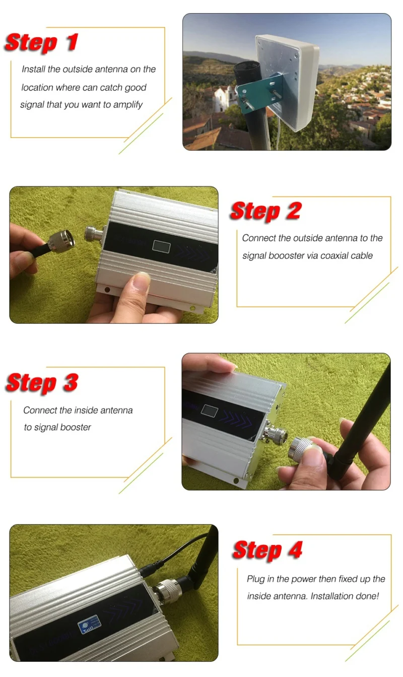 -- Частота:1800 МГц полоса 3 4G LTE2100 МГц полоса 1 3g WCDMA 4G LTE2600 МГц полоса 7 4G IMT LTE plus-- Усиление: 60 ~ 65 дБ (серебристый). 70 ~ 75 (синий)-- Выходная мощность: 17 дБм-- Покрытие: 300 квадратных метров