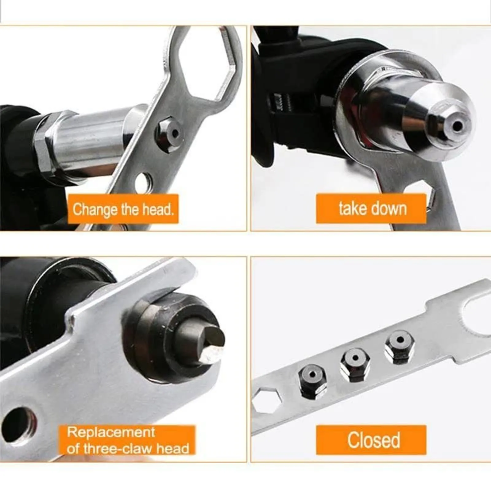 Простой в использовании: 1. Отрегулируйте электрическую дрель до соответствующего положения шестерни. 2. Откройте зажим для сверла, вставьте адаптер, положительное вращение, зажмите соединитель. 3. Включите функцию обратного вращения сверла, пока не услышите звук «DADADA», а затем поместите соответствующий размер. 4. Включите функцию положительного вращения, выровняйте отверстия и вставьте заклепки. 5. Включите функцию обратного вращения и выйдите.