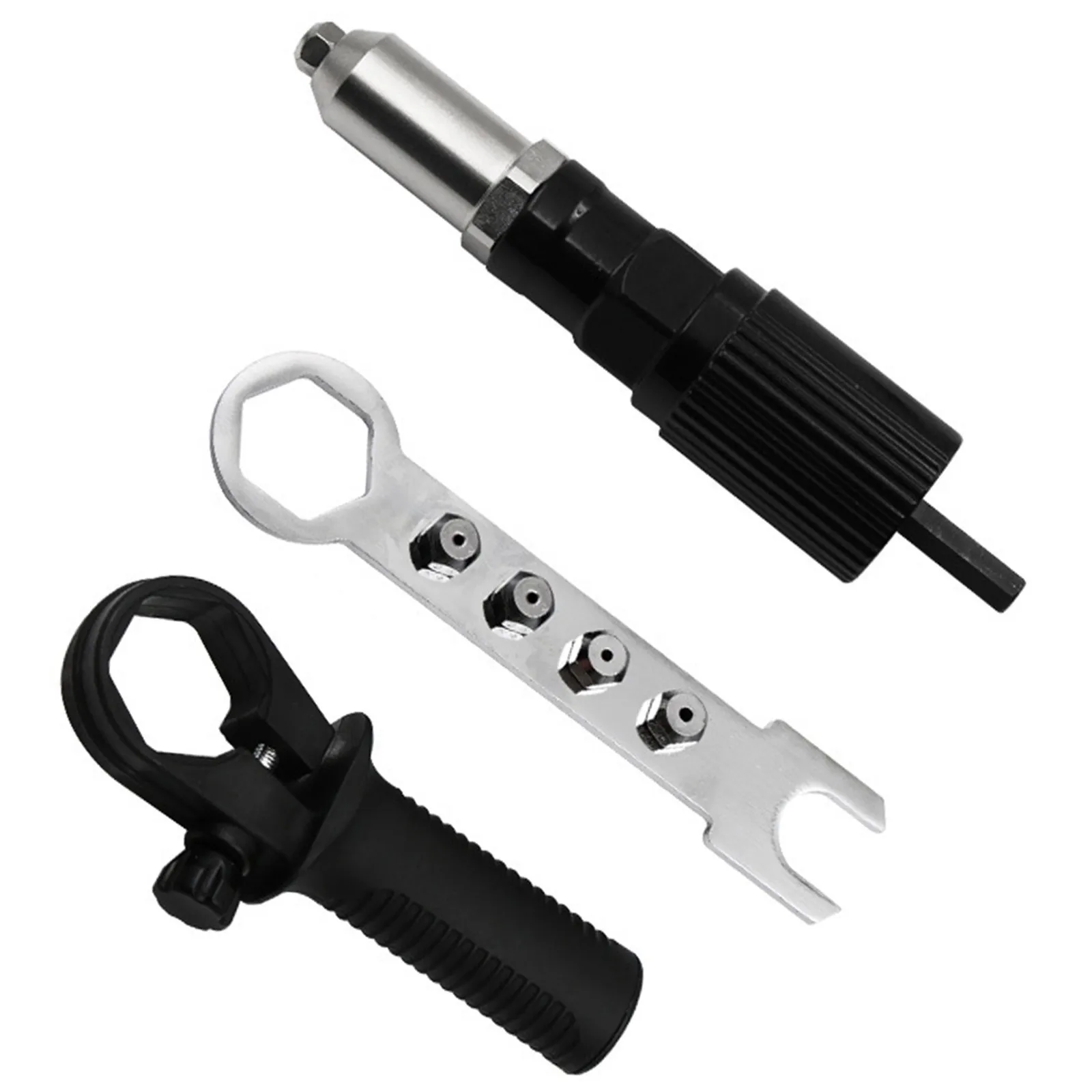 Описание товараЭлектрическая дрельПродуктАдаптер-профессиональный набор инструментов для заклепок с алюминиевым литьевым корпусом и нескользящей Handle-4pcs откидной головкой и гаечным ключом.ПродуктМеталлический адаптер имеет более низкий уровень шума, более эффективный, малый размер и удобен в переноске, универсальное сверлильное крепление для легкого нанесения гаек на различные материалы.