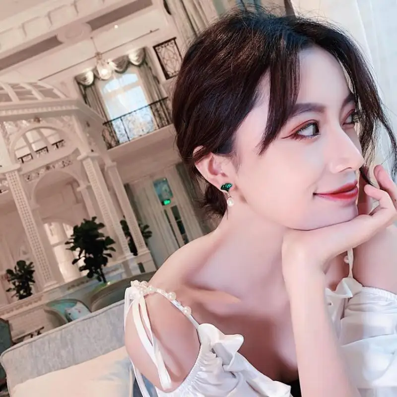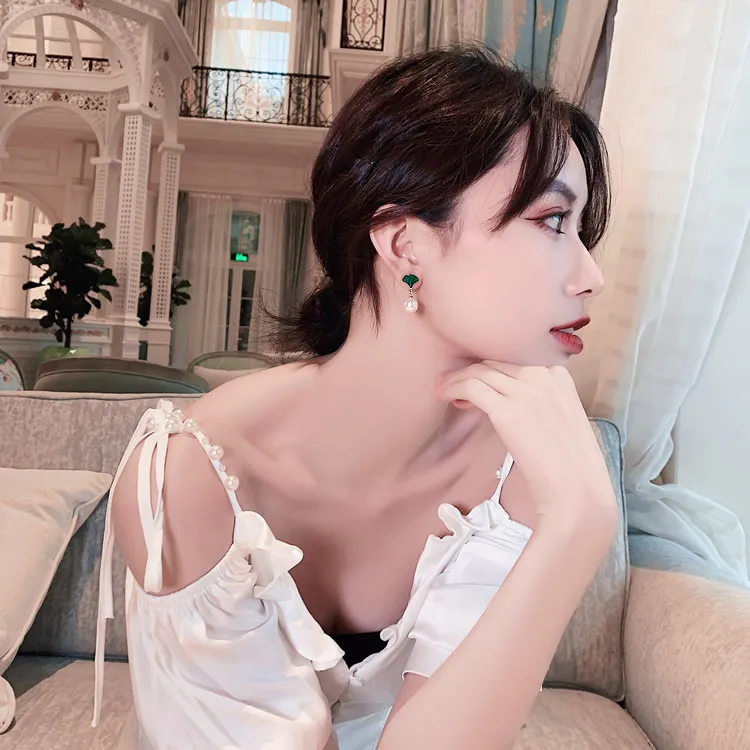 S925 наборе серебристых спиц из корейской версии гинкго зеленый имитация жемчуга в виде листа маленькая свежая и возраст-сокращение для девочек элегантные серьги, ювелирное изделие