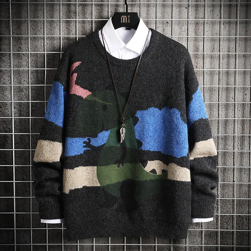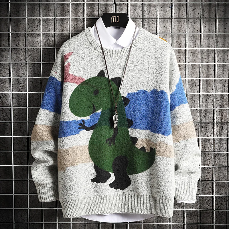 Мужской вязаный свитер в стиле оверсайз с аниме динозавром, джемпер в стиле хип-хоп, серый свитер в стиле Харадзюку, 2021