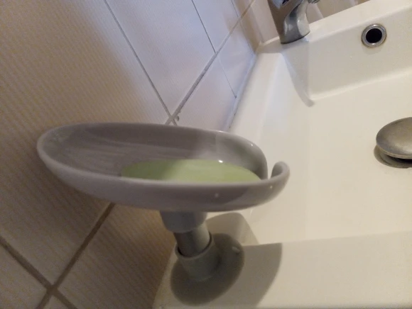 Соответствует описанию. Очень удобно, вода стекает в раковину, мыло всегда сухое. Занимает минимум места на раковине. Доставили досрочно.