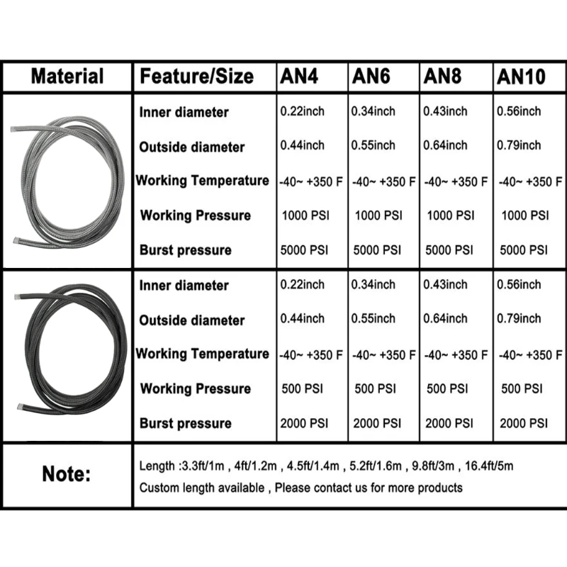 Применение:OOTDTYГоночное топливо, газ насоса, топливо с этанолом, топливо на спиртовой основе, моторное масло и охлаждающая жидкость и т. д. Характеристики топливного шланга из нержавеющей стали:Серебряный цветВнутренний материал шланга: CPE синтетический материал шлангаСнаружи: покрыта 2 слоями высококачественных проводов из нержавеющей сталиРабочая температура: от-40 F до + 350 FРабочее давление: 1000 PSIДавление разрыва: 5000 PSIПосылка включает в себя: 1 х 1 м шланг для газового топлива