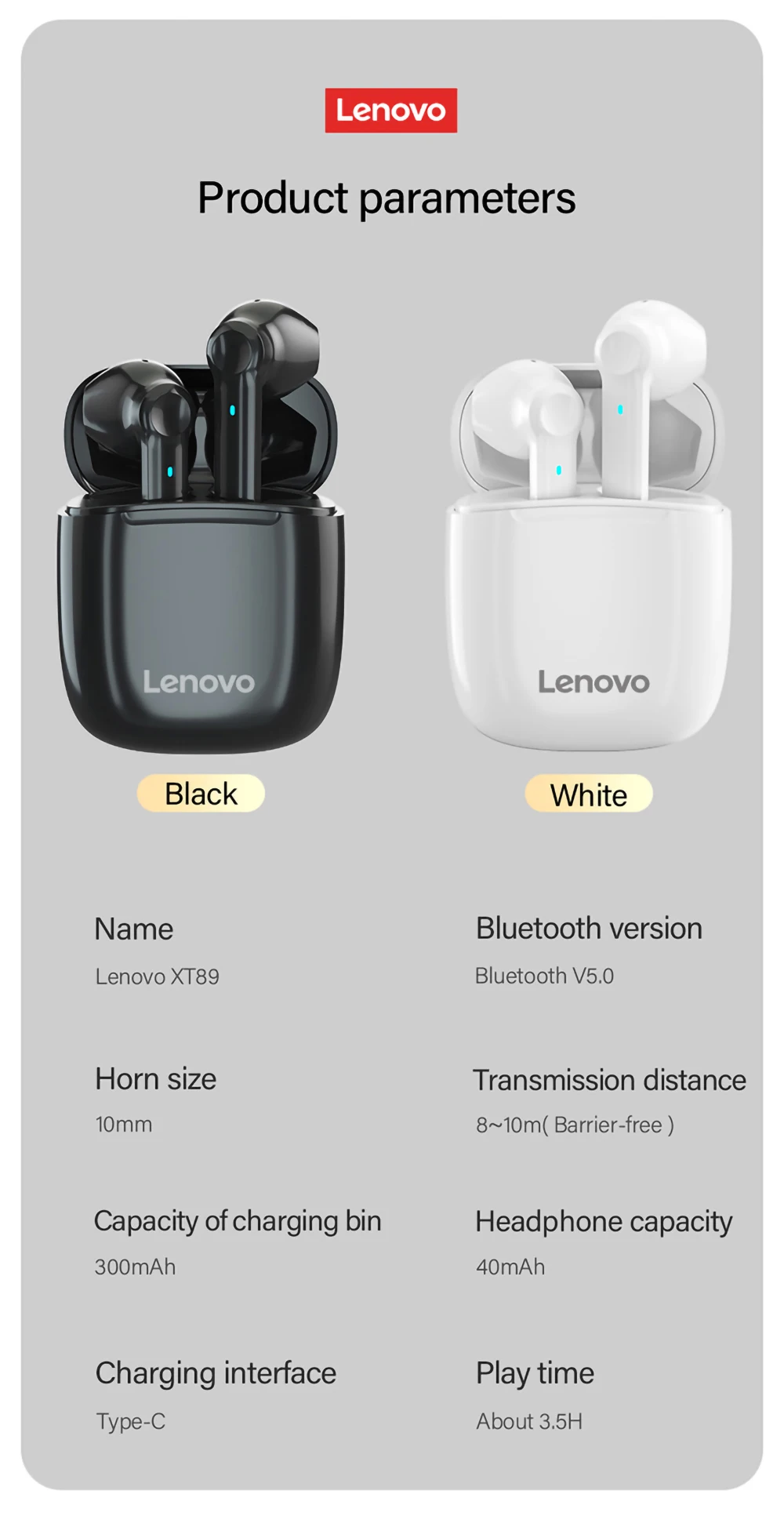 TWS-наушники Lenovo XT89 с поддержкой Bluetooth 5,0 и защитой от воды